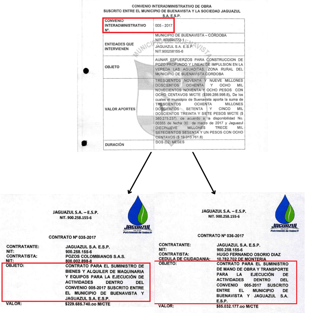 Así ocurrió con las alcaldías de San José de Uré y Buenavista. Ambos procesos sumaron $2.013 millones y luego fueron tercerizados por Jaguazul en seis ocasiones para prestar servicios de acueducto y alcantarillado. El convenio de San José de Uré fue tercerizado cuatro veces, a través de Ingeniería del San Jorge SAS, Elecom Ltda, Soluciones técnicas del San Jorge Ltda y Hugo Fernando Osorio Díaz. Este último también recibió un subcontrato en el convenio con Buenavista, al igual que Pozos colombianos SAS. Los subcontratos sumaron en total $1.433 millones; es decir, hubo una diferencia de al menos $579 millones, en comparación con el valor inicial de los convenios.
