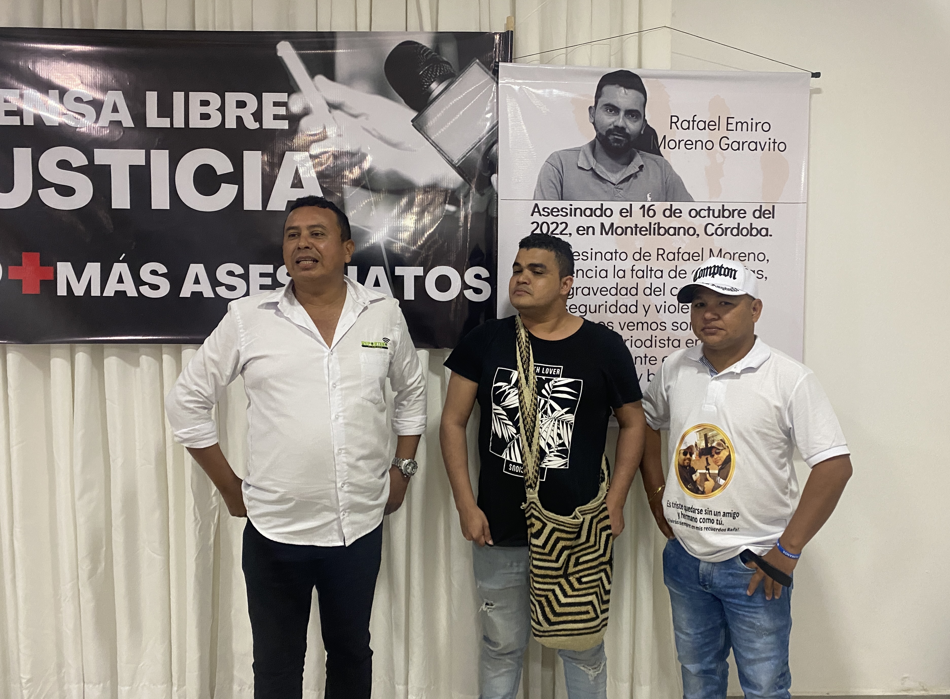 Cuando Pico dice “nosotros tres”, incluye a Organis Cuadrado y Walter Álvarez, dos colegas que asistieron tras el asesinato de Moreno a un homenaje gremial en Montelíbano. Unas pancartas y la foto del periodista dominaban la pared con estos mensajes: “Que ser periodistas y denunciar no nos cueste la vida” y “No necesitamos flores, queremos garantías”.