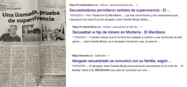 Noticias falsas de diferentes medios sobre el secuestro de Juan Camilo Borja en Montería.