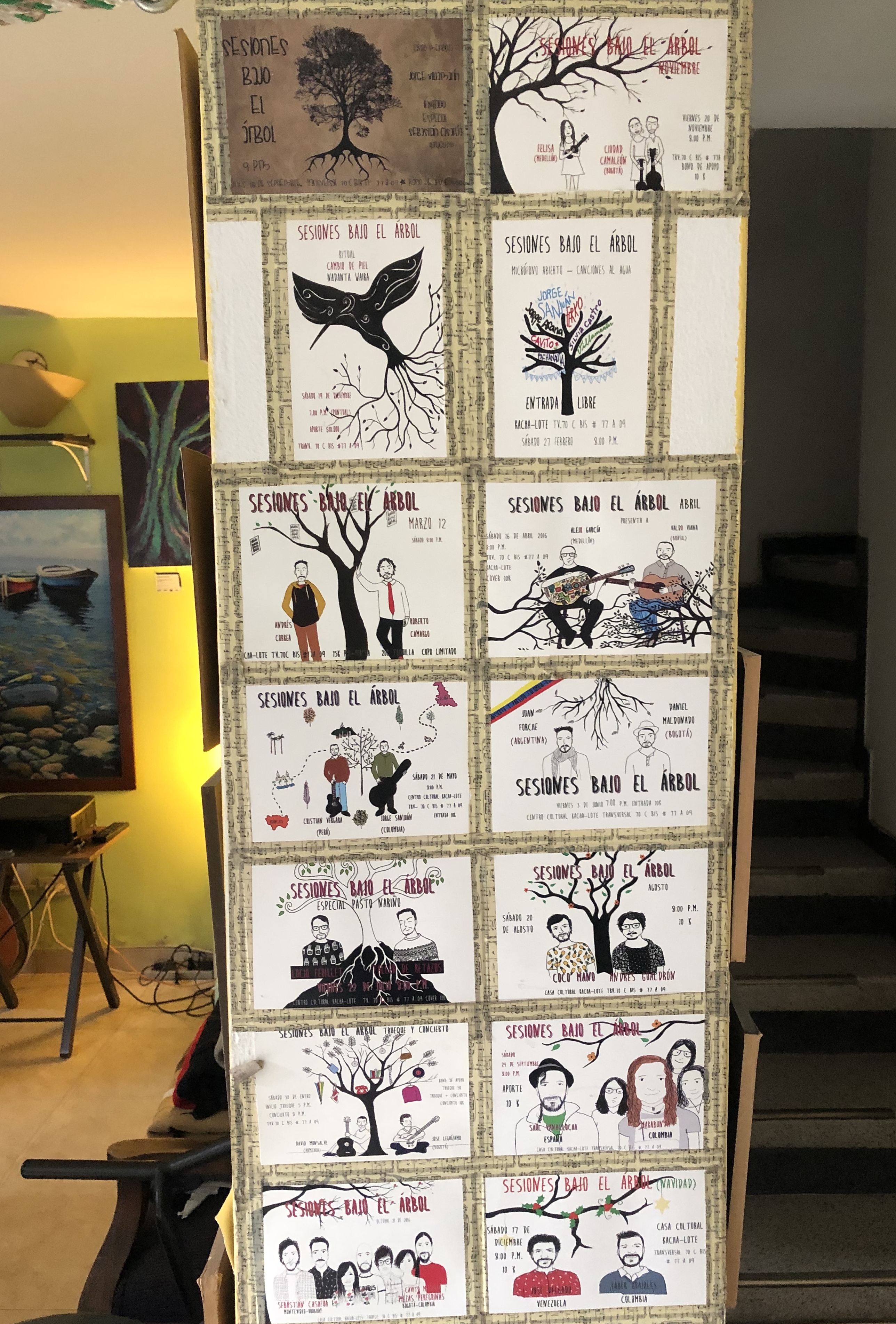 Por donde quiera que se mire, hay algo que decora cada espacio de esta casa. Aun así, hay ornamentos que llaman la atención más que otros, como una columna que está en la sala, que de forma vertical, por una parte, tiene fotos y retratos de personajes reconocidos como Gustavo Cerati, John Lennon, Marilyn Monroe, Janis Joplin y Jaime Garzón. Sin embargo, la otra parte de la columna tiene una decoración más propia del sitio, ya que tiene pegados las boletas de los conciertos de Sesiones Bajo el Árbol. Cada boleta consta de ilustraciones de los artistas que se presentan el día del concierto. Este gesto artístico, también, es hecho por Cavito Mendoza, en la que la cara de cada artista se vuelve caricatura y un acto simbólico para este proyecto.