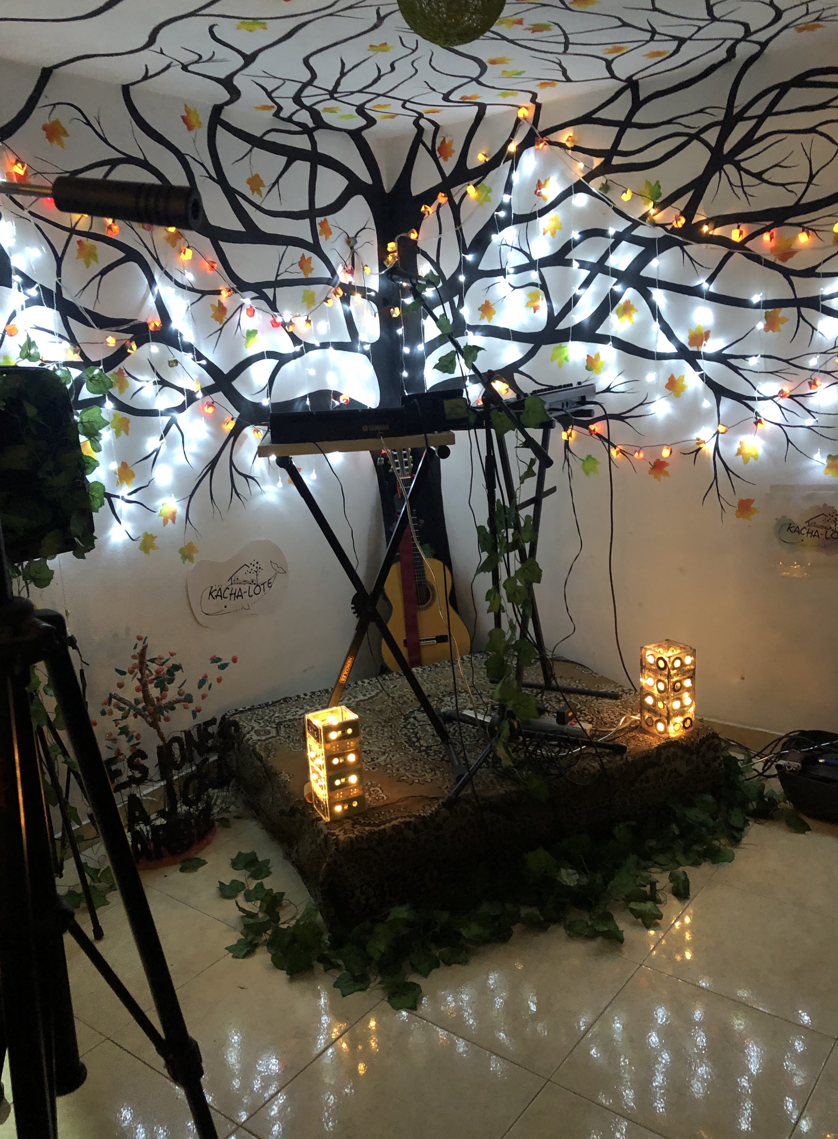 Muchas de estas obras o decoraciones, como el árbol que está pintado en la sala, son hechos por Cavito Mendoza, una de las fundadoras de Sesiones Bajo el Árbol y actual gestora. Es ella quien acude a sus dotes y sus manos inquietas para rehacer o modificar el espacio. Lleva el pincel a las paredes y traza líneas que después se convierten en objetos con significados, como lo son algunos cuadros que están colgados en las paredes o la pintura en negro que retrata los brazos de guitarras y bajos.