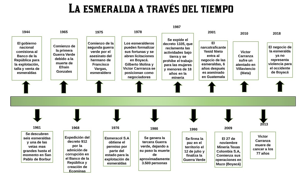 La guerra que se libraba en la zona esmeraldera de Colombia, conocida como la guerra verde, era especialmente cruenta. Giraba alrededor de las familias que poseían las minas ricas en esmeralda y causó la muerte de al menos 1.200 personas, algunas de ellas después de haber sido víctimas de torturas.