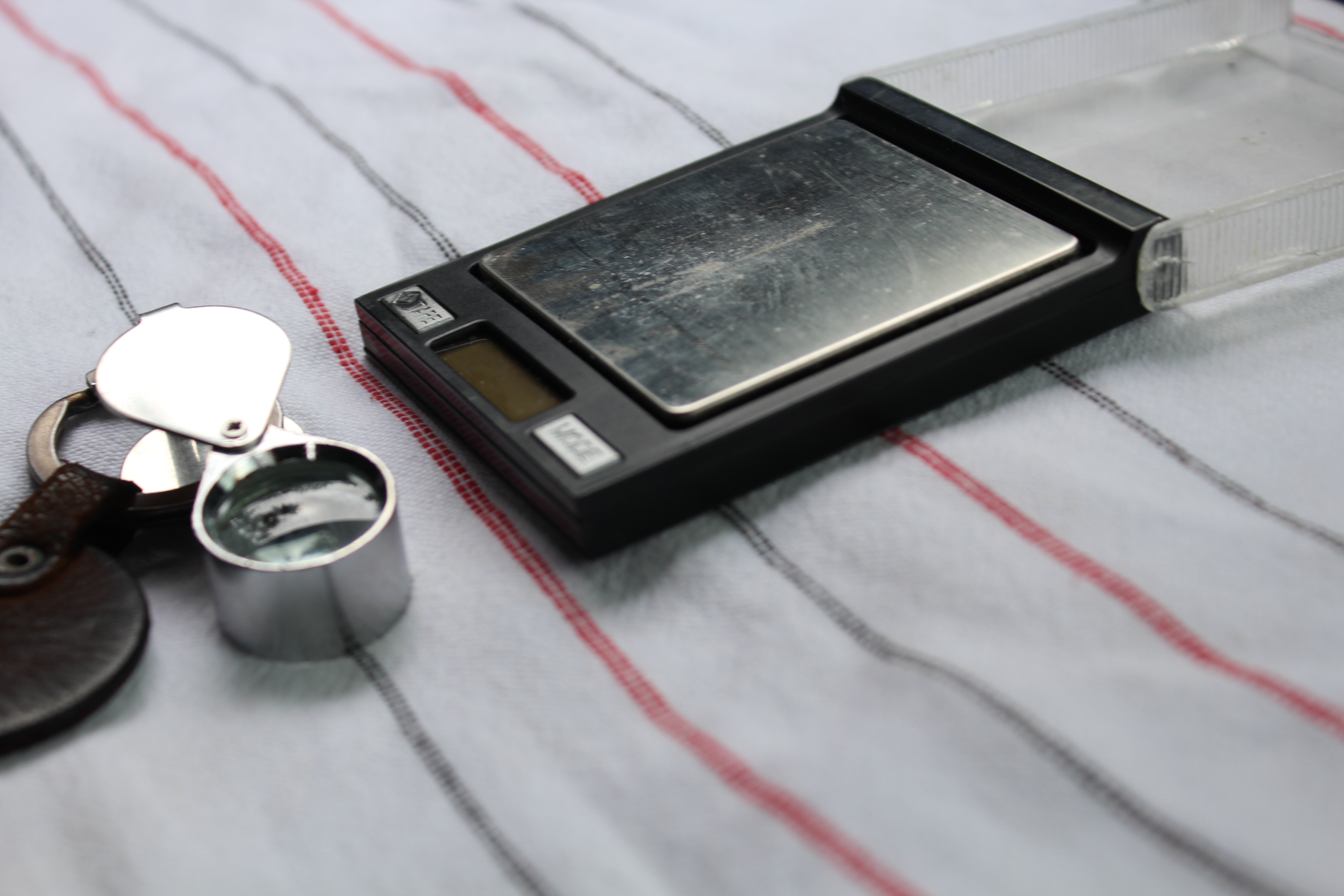 La lupa a la izquierda y la quilatera a la derecha, implementos con los que todo esmeraldero debe contar.