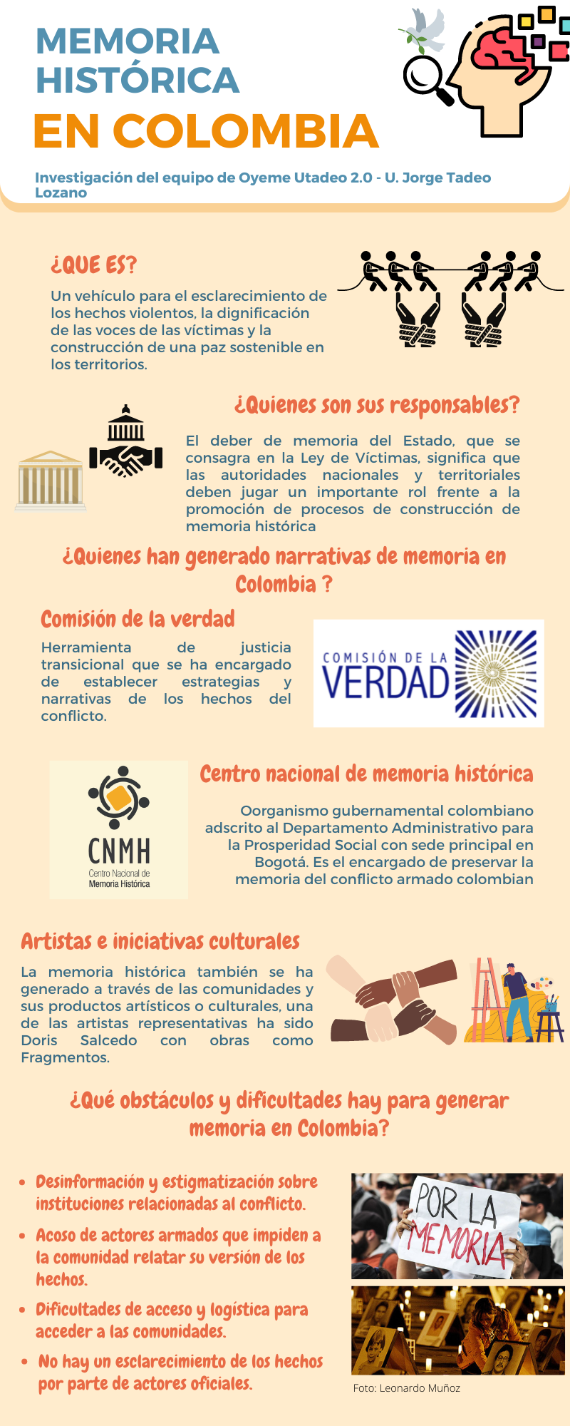 Esta producción e investigación sonora sobre el valor y los retos que tiene la generación de memoria histórica en Colombia, fue producida por estudiantes de Comunicación Social y Periodismo de la Universidad Jorge Tadeo Lozano para su programa "Radar Musical", una de las franjas de la emisora Óyeme Utadeo 2.0. Este relato se centra en las comunidades para las que ha sido mucho más difícil generar relatos comunes de memoria: Los migrantes, las comunidades indígenas e incluso los mismos investigadores.