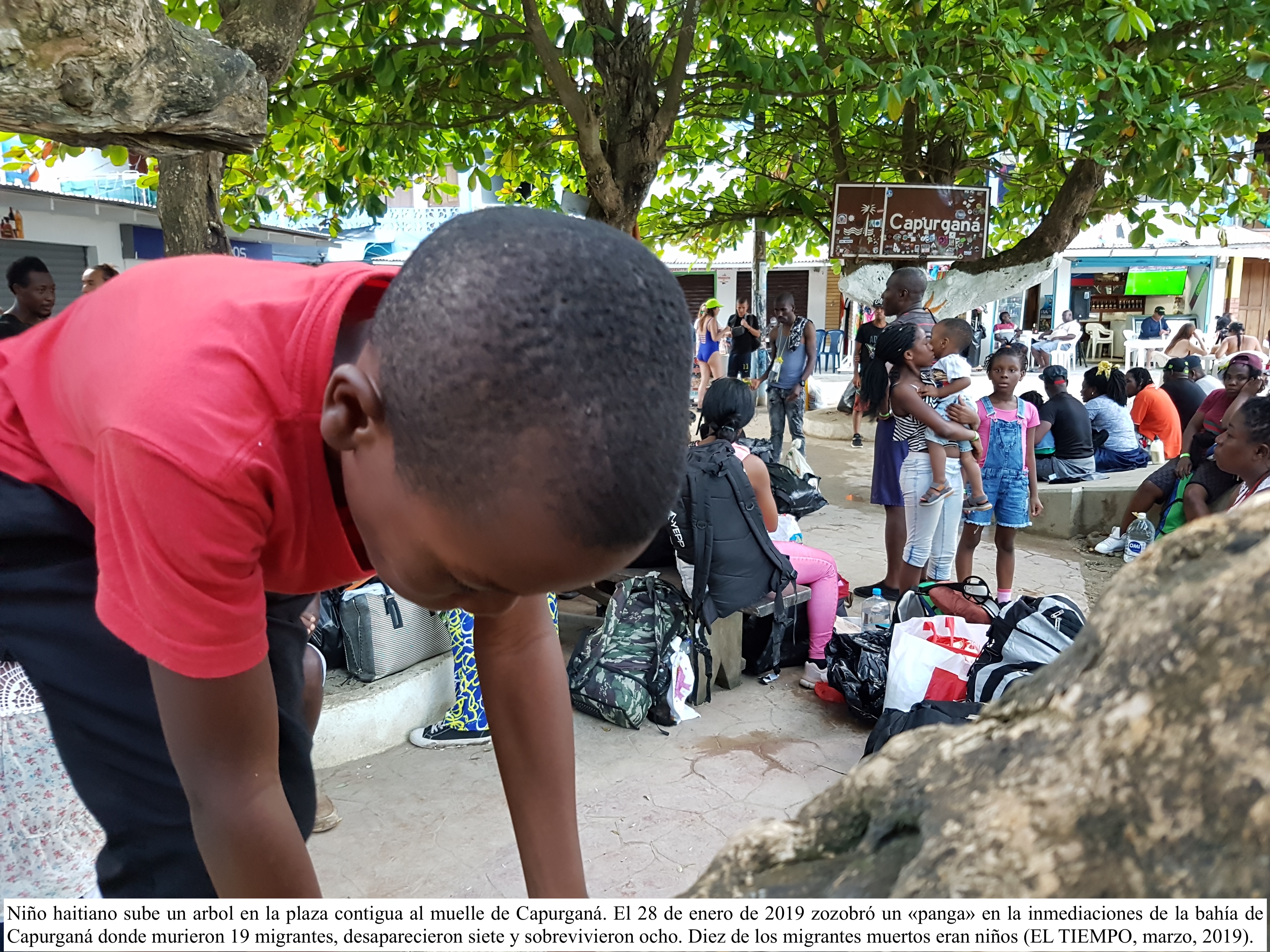 De súbito, la pequeña plaza que procede al muelle se colma de hombres, mujeres, niños y nonatos, cuya lengua es inaudible y traen consigo carpas, linternas, galones de agua y táperes con comida. La mayoría de los adultos, hombres y mujeres cuyo tono de piel es como el ébano, portan un funda impermeable para celulares que pende de su cuello y cae hasta la altura del abdomen, pero en ellas no hay celulares sino una libreta azul oscura en la que se lee: RPUBLIQUE D’HAITI PASSEPORT.