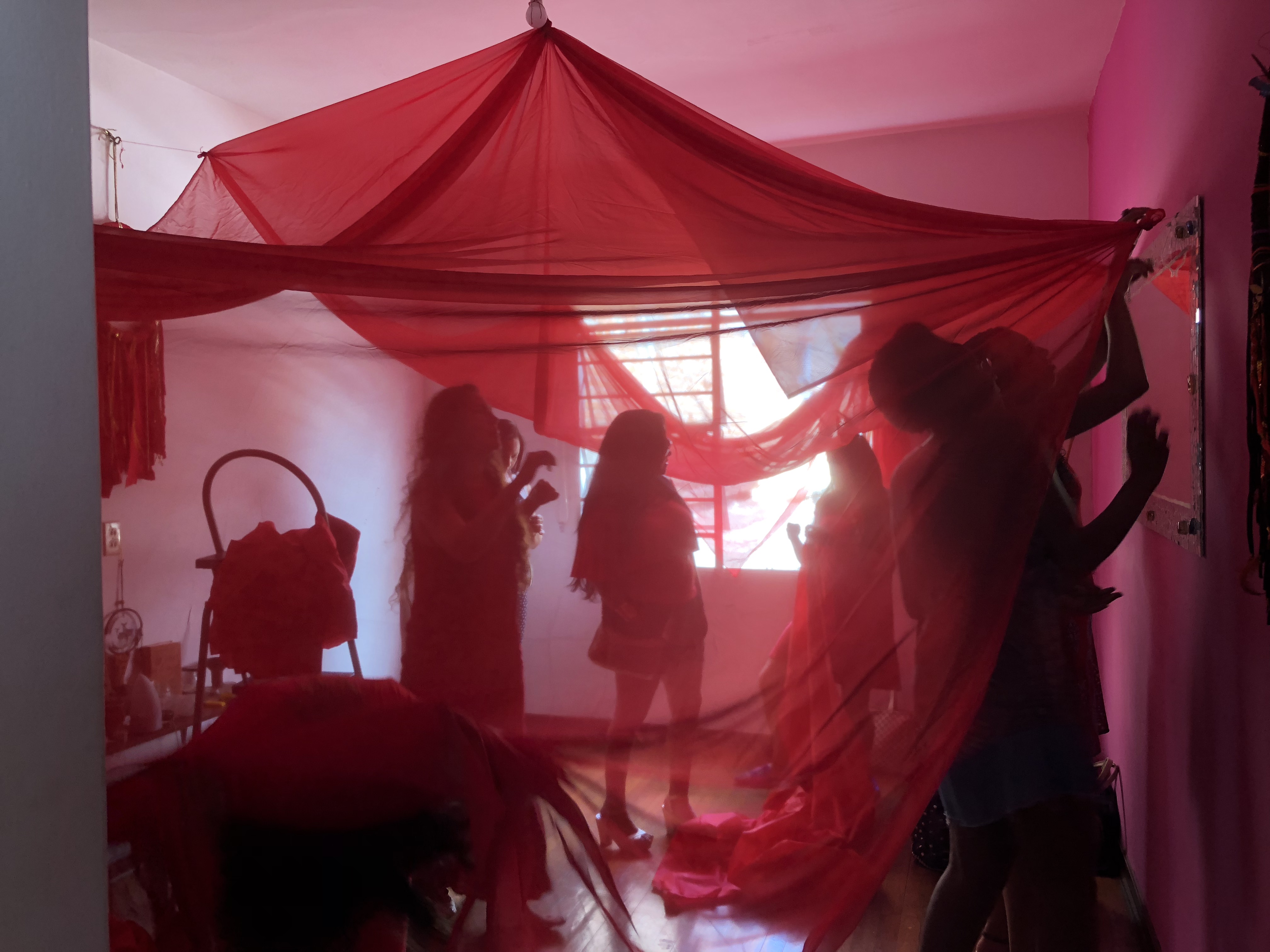 Transformación de una habitación en un templo rojo mediante velos, que representa la conexión que existe entre las mujeres y la tierra. (Foto: Laura Rey)