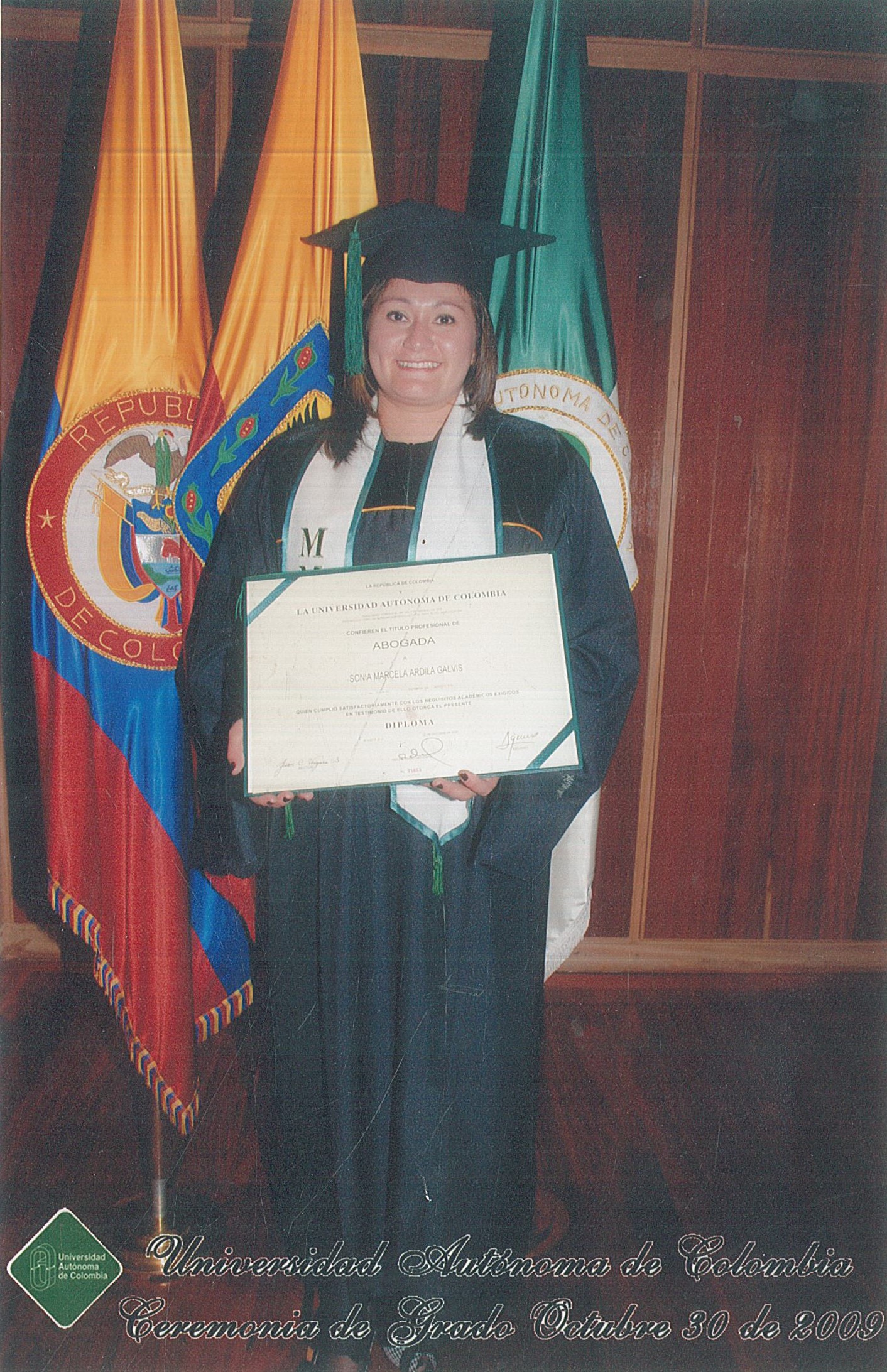 Tarde oscura y lluviosa. Las gotas caen sobre las tejas y ventanas y en el apartamento se hace más evidente la lluvia, el inmueble se encuentra ubicado en el tercer piso. Consta de dos habitaciones ubicadas justo al cruzar la puerta de entrada y girar a la izquierda. Las habitaciones son conjuntas, cada una en su interior posee una cama y un televisor. A menos de un metro se encuentra el baño y hay una pared de cuatro metros que lo separa de la cocina. La sala cuenta con dos sillas, una ubicada en sentido vertical y en la otra horizontal, y a espaldas de ellas, está la ventana que da hacia a la calle. Allí se encuentra sentada Marcela Ardila, mujer de manos delicadas, una de ellas, la izquierda, casi cerrada. Trata de empuñar los dedos, pero no los cierra totalmente ya que de por medio están los dedos de su mano derecha que son movidos por su otra mano para ser ejercitados. Lleva puestos unos tenis color negro, jean y blusa color blanco, ella está sentada en el mueble que está en sentido horizontal. Cada palabra expresada por ella la acentúa con seguridad, pero hay ocasiones en que no termina la idea, y es ahí cuando hace esfuerzo por concluirla. Su sueño fue ser abogada. Culminó sus estudios en la Universidad Autónoma de Colombia en el año 2009. Su diploma de grado está colgado en una pared de la sala, ella camina hacia él, y estando frente al diploma, aparece su hija María José. Una niña de piel blanca, cabello rubio y ojos color café claro, y expresa: “Felicitaciones, mami”.