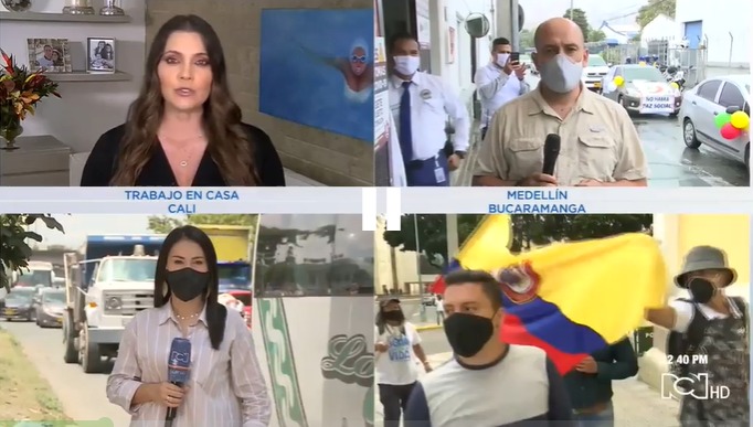 Después de que se emitiera el informe desde la ciudad de Calí, Cristian Diaz logró salir en vivo. Foto de la emisión del mediodía de Noticias RCN.