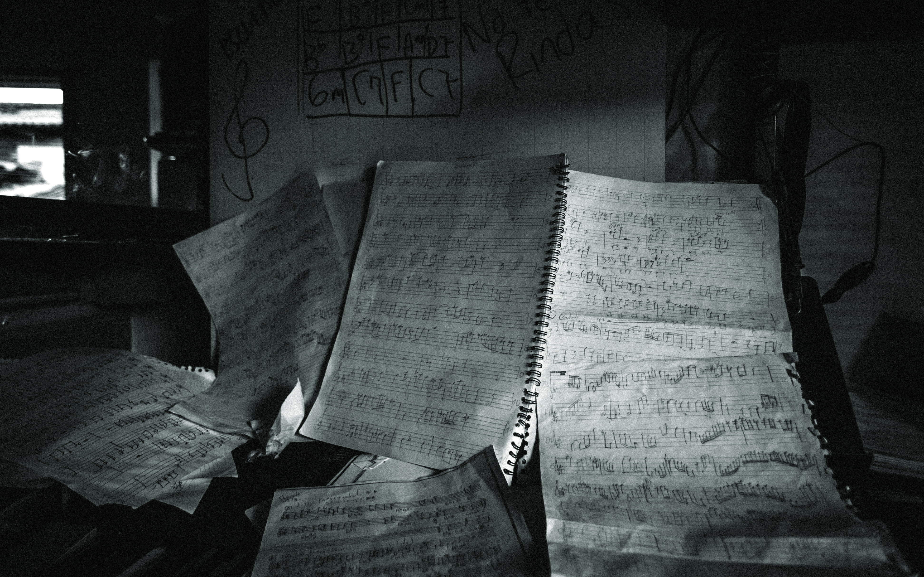Partituras escritas por el músico César Infante, tituladas Saxofunk, Ocurrencias y Bambucox. (Foto: José David Cruz)