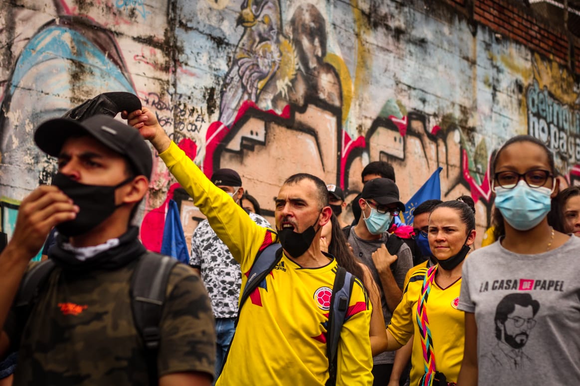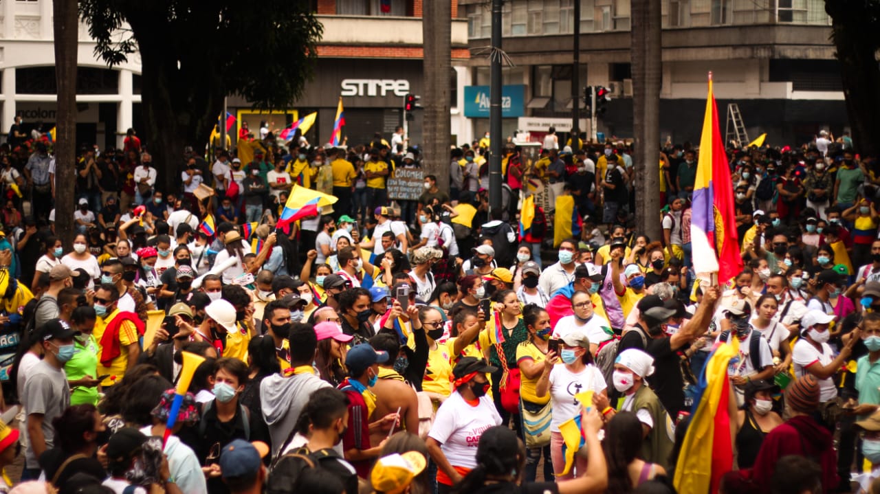 Desde el 28 de abril los manifestantes se volcaron a las calles en varias ciudades del país, como Pereira (en la foto), para participar en el paro nacional. Una de las razones para salir fue el rechazo a la reforma tributaria. Ante la presión social, el presidente Iván Duque anunció el domingo 2 de mayo el retiro del proyecto. Foto: Margarita Rojas/La Cola de Rata.