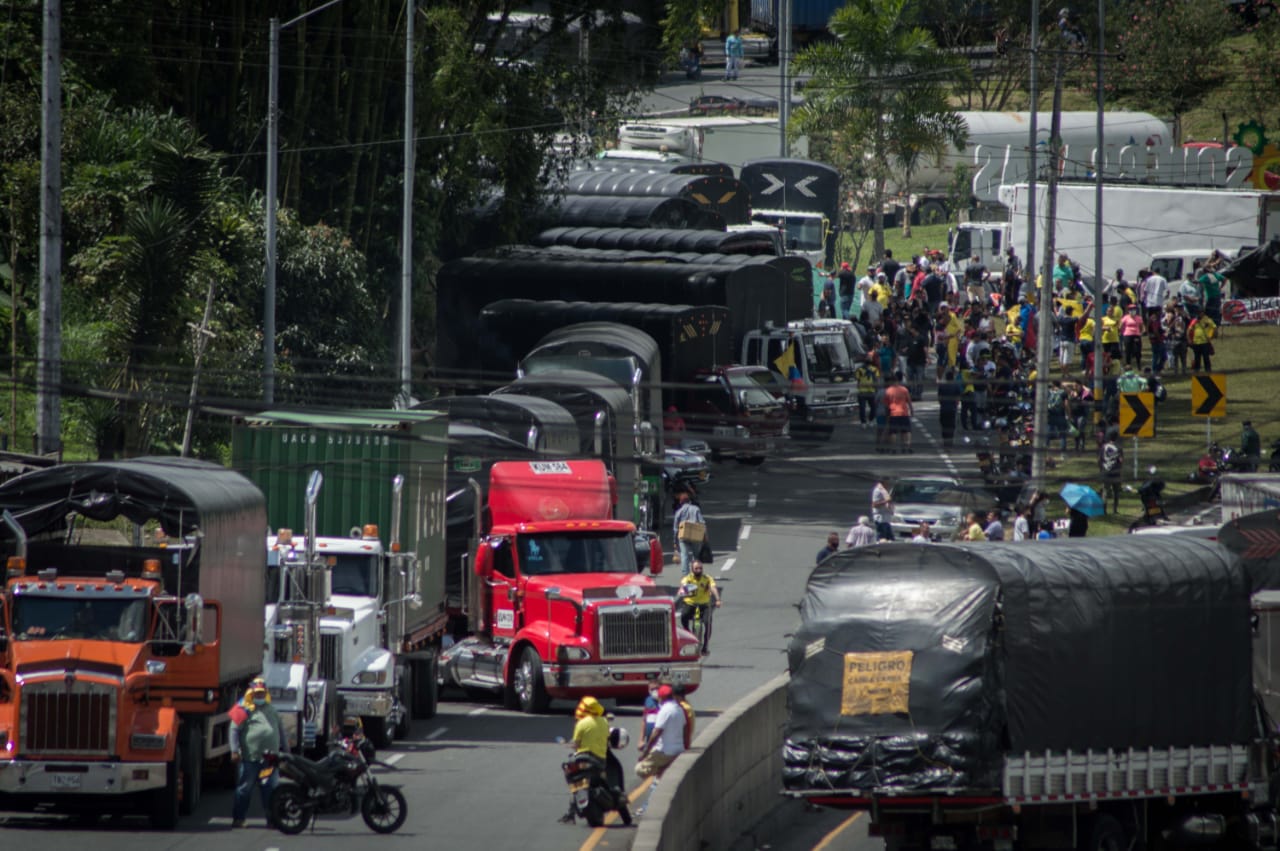 Camioneros bloquean la vía en el sector de la Romelia, el cual comunica los municipios de Santa Rosa de Cabal y Dosquebradas. Solo permiten el paso de personal de la salud y de medicamentos. Accedieron a la apertura de un corredor humanitario. Foto: Jhonathan Quintero/La Cola de Rata.