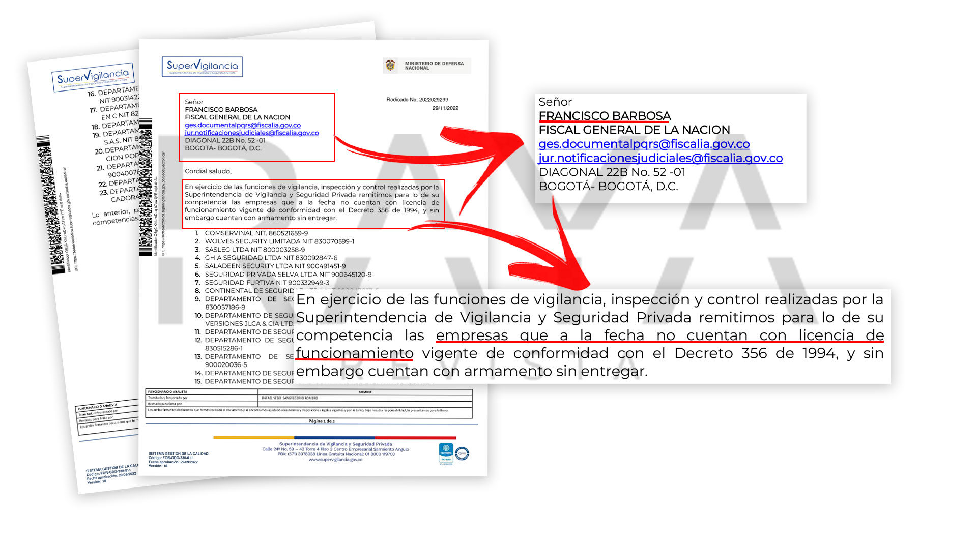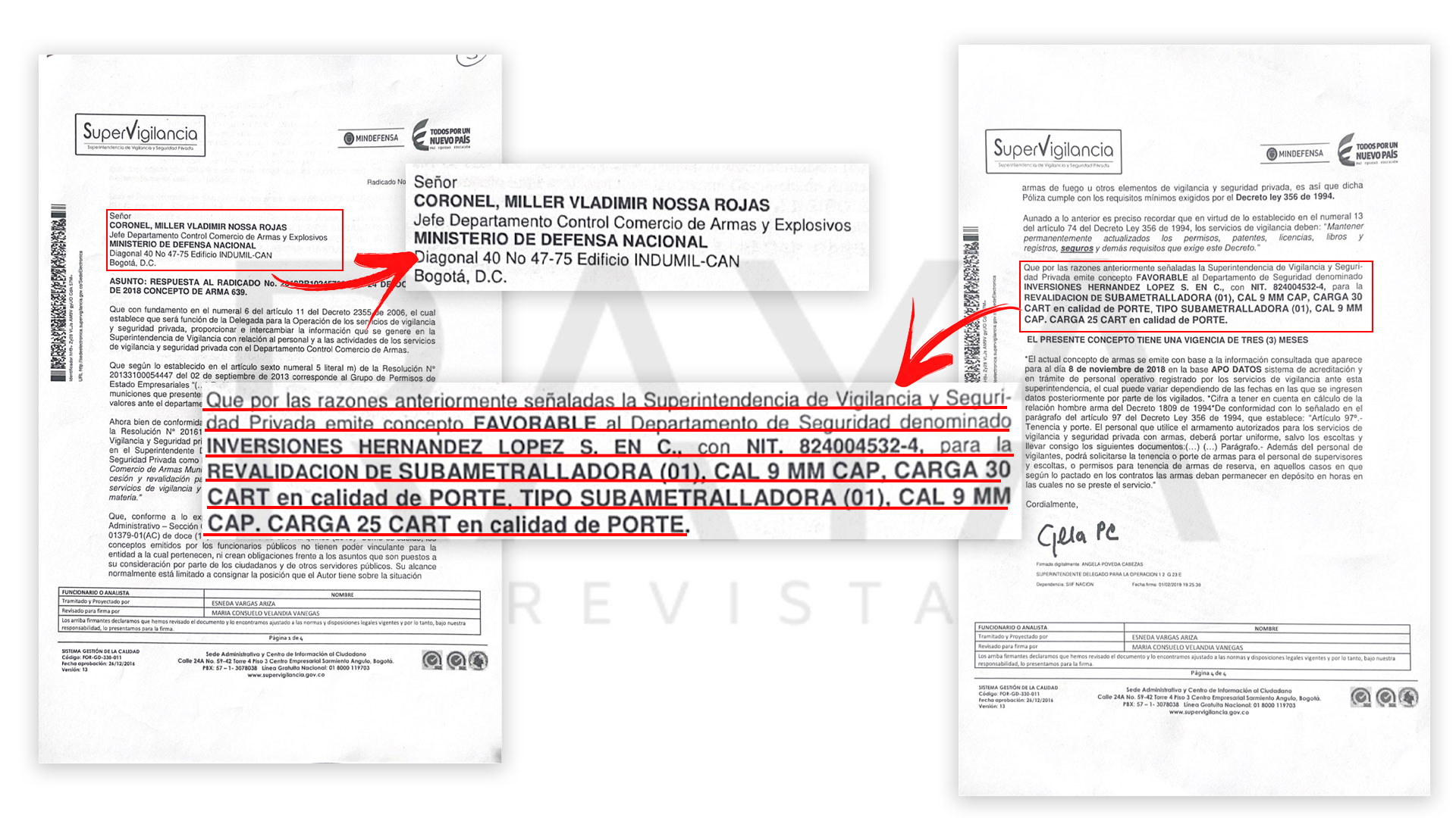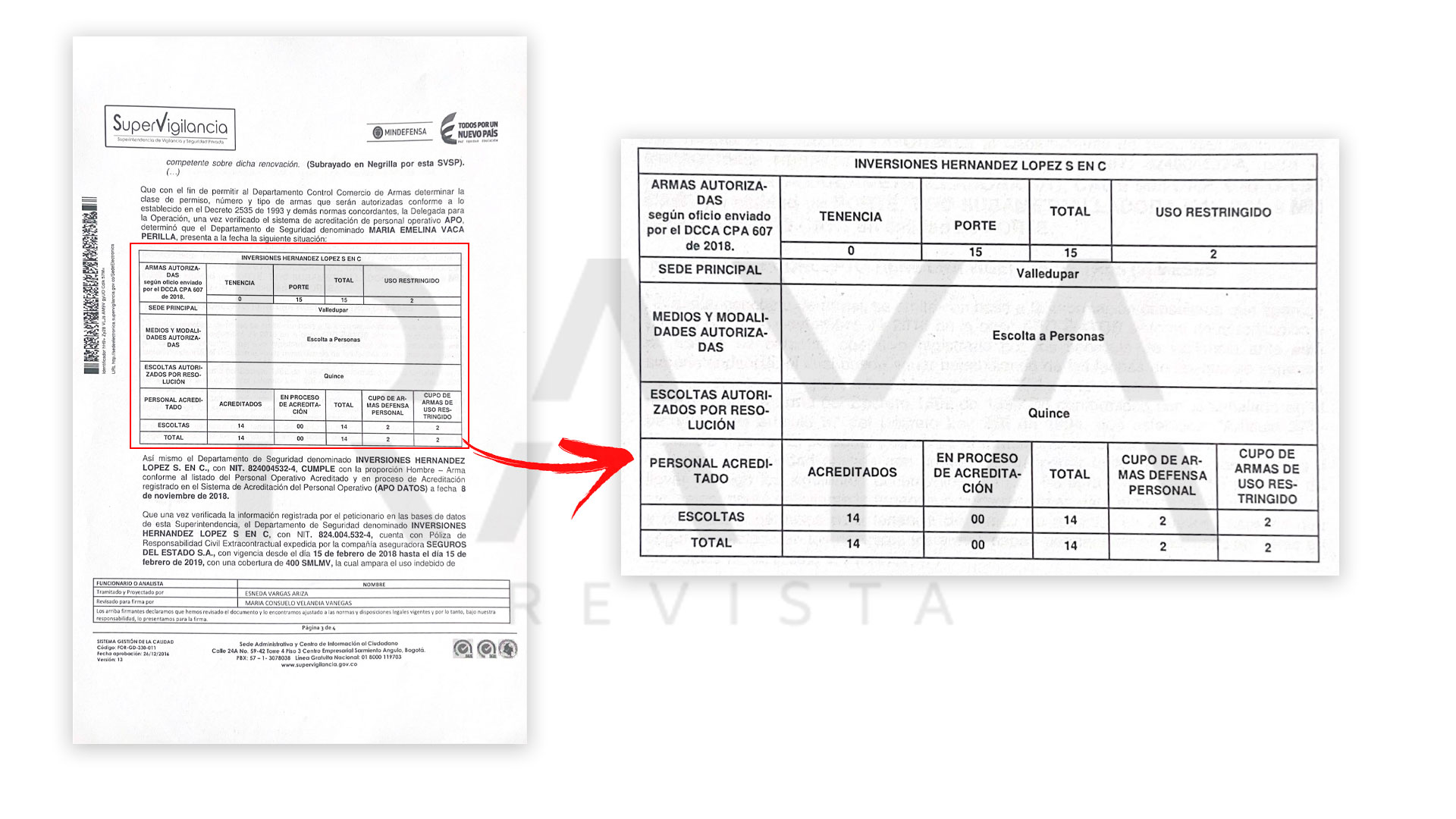 La revista RAYA tuvo acceso a las 23 carpetas donde aparecen desde departamentos de seguridad de empresas del ‘Ñeñe’ Hernández y la familia Gnecco en el Cesar, hasta una empresa de vigilancia en Villavicencio, Meta, que hoy administra 102 armas de manera ilícita. La figura de los departamentos de seguridad nació con el Decreto 356 de 1994 para que las organizaciones empresariales gestionen su seguridad con ayuda de las armas y las instituciones del Estado, en caso de existir amenazas de secuestro o extorsión por parte de grupos armados ilegales. Por eso la SuperVigilancia es la encargada de otorgar y vigilar las licencias de funcionamiento, y el Departamento de Control y Comercio de Armas, de aprobar y entregar las armas que haya determinado el estudio de riesgo. Este departamento depende del Comando General de las Fuerzas Militares.
