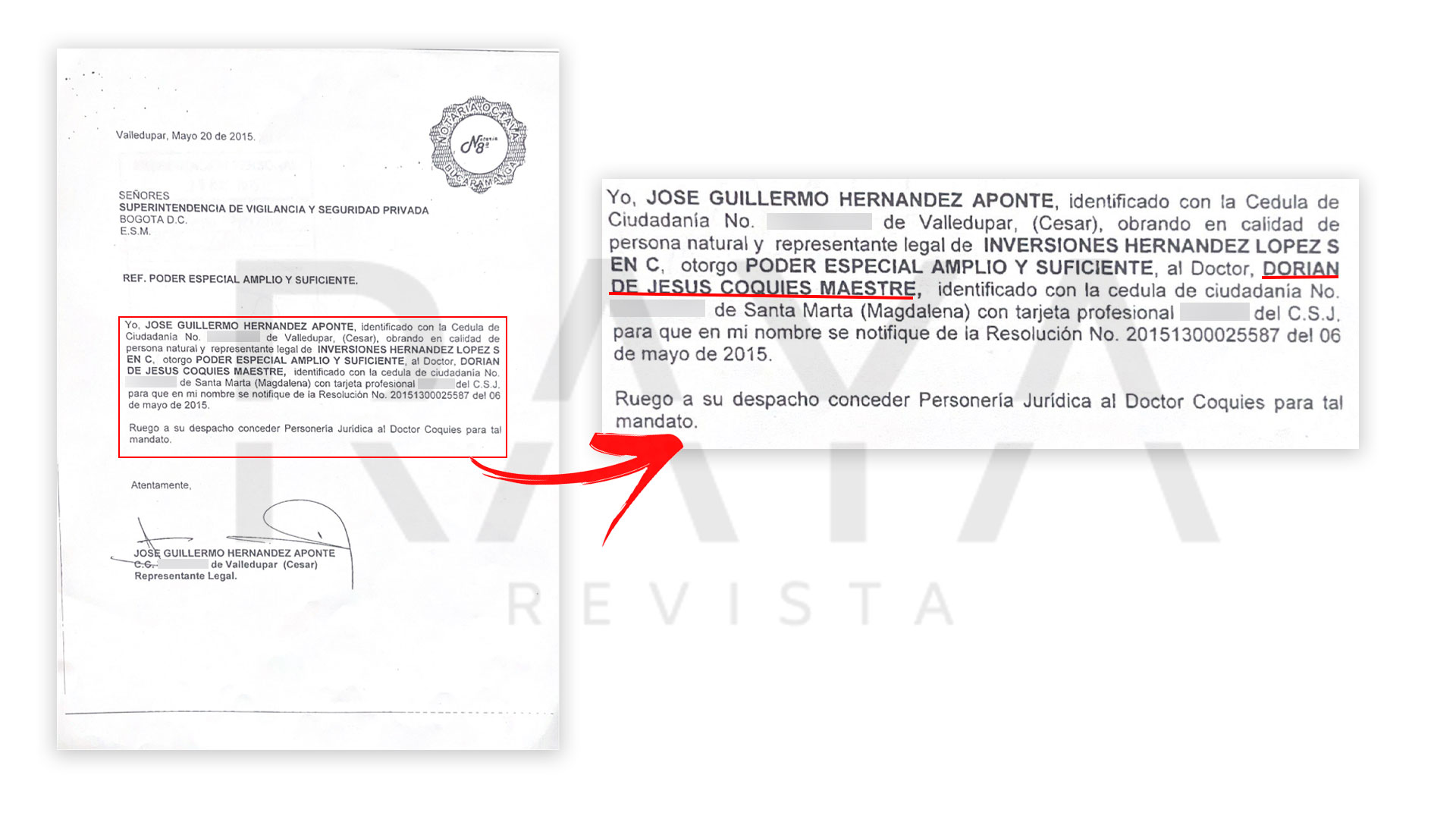 Por eso, a principios de 2014 el ‘Ñeñe’ Hernández empezó a allanar el camino para tener un grupo de hombres armados para proteger su vida y la de su familia, ya que los sicarios lo empezaron a señalar ante la Fiscalía como el determinador del crimen. El abogado Coquies Maestre recibió el poder de Hernández para representarlo ante la SuperVigilancia. Entre el 15 de junio y el 15 de agosto de 2014, Coquies Maestre realizó el estudio de seguridad con el que el ‘Ñeñe’ terminó de argumentar ante la SuperVigilancia por qué su empresa Inversiones Hernández López S. En C. necesitaba los escoltas y las armas. Según Coquies, “por la información de un posible secuestro e intento de asesinato nuevamente contra uno de los miembros de la familia Hernández Aponte”.