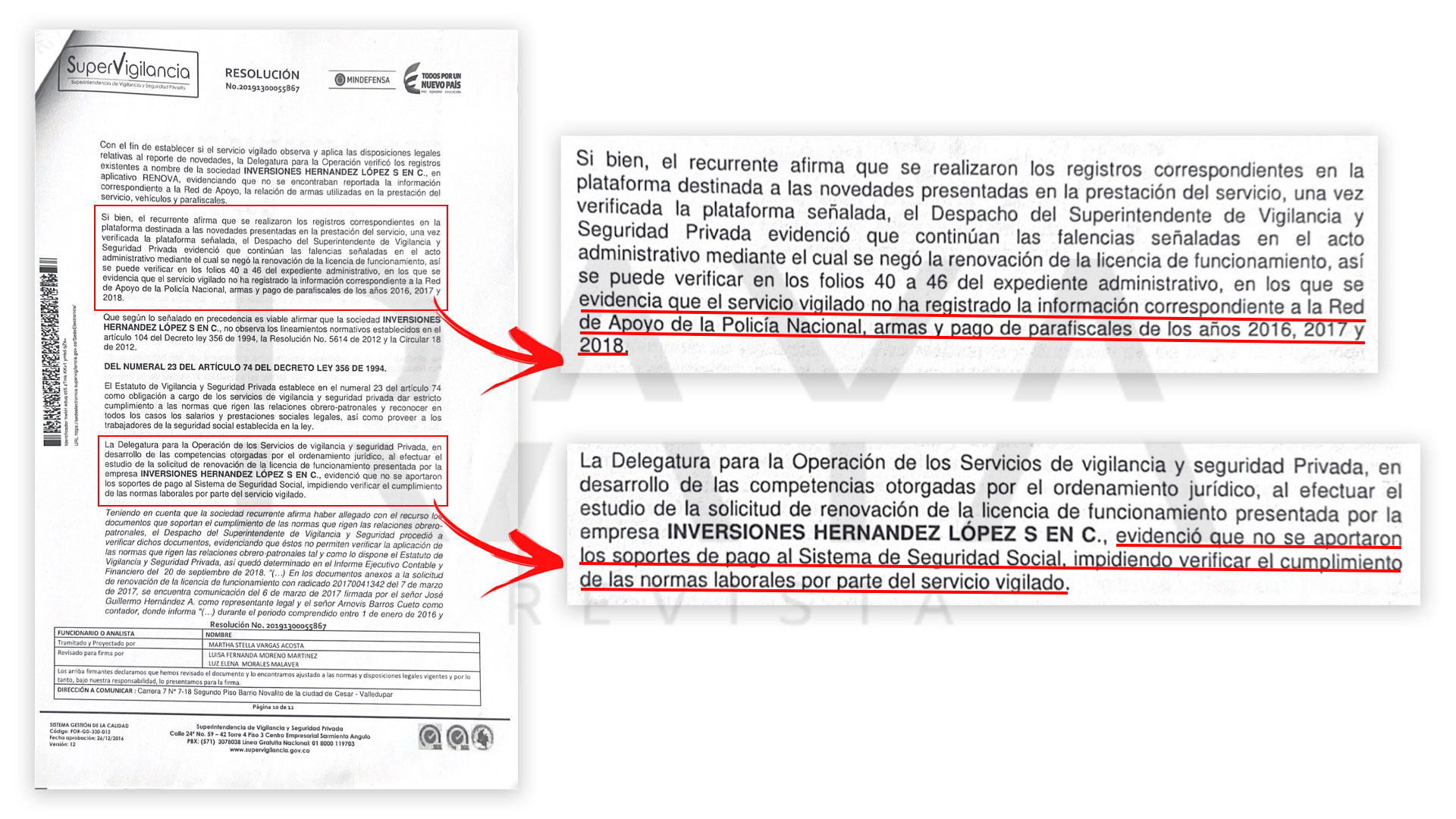 Resolución de la SuperVigilancia donde negó la renovación de licencia de funcionamiento al departamento de seguridad de la empresa del ‘Ñeñe’.