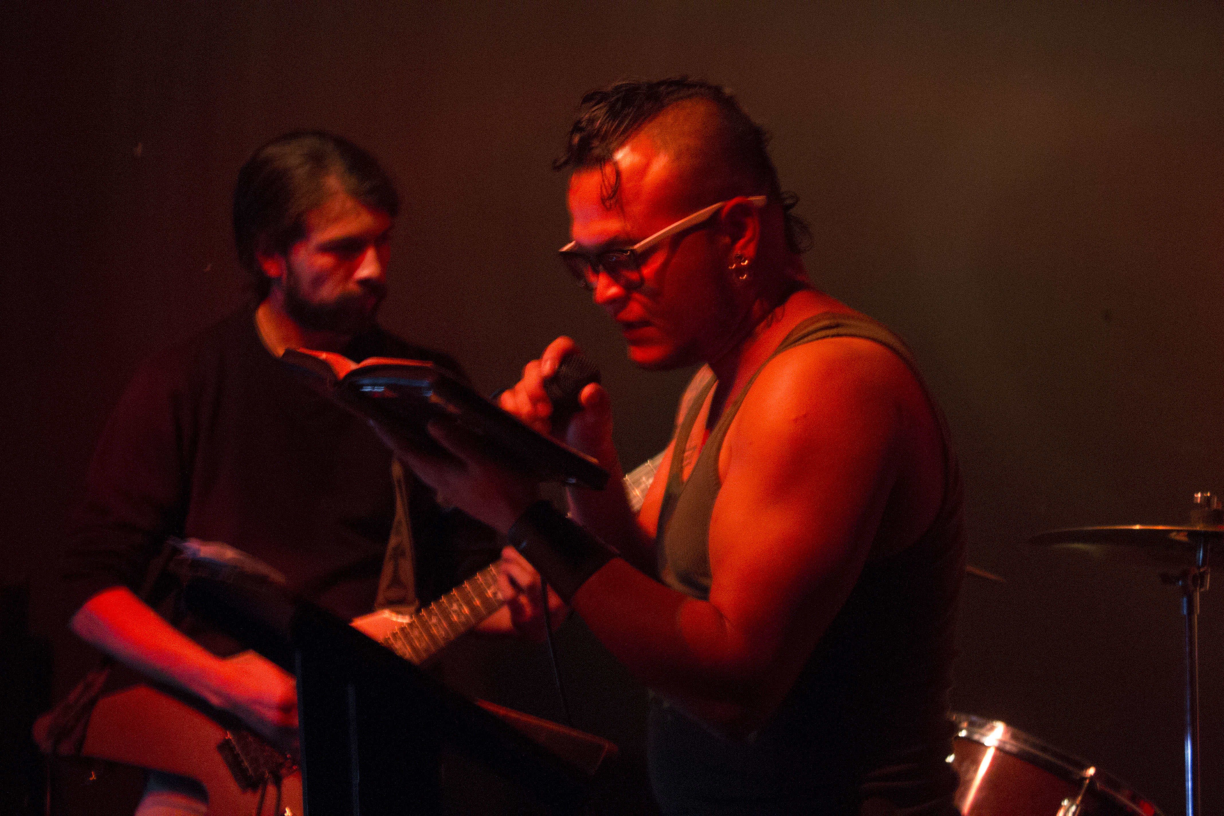 Bajo la luz tenue del reflector rojo, Carlos Arias, un joven moreno, grita con voz grave: