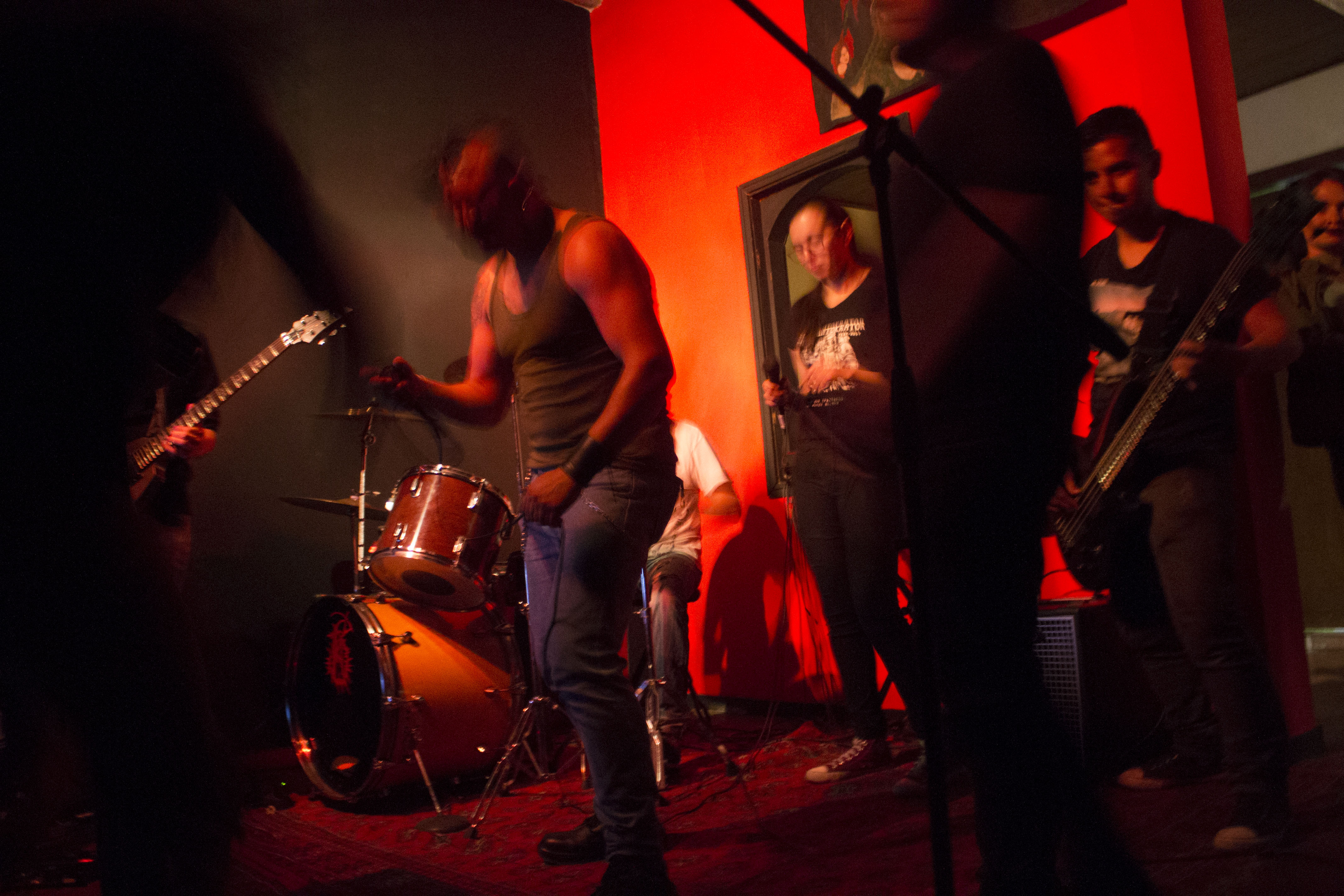 Palmas y gritos de júbilo llenan el segundo piso, es la cresta del frenesí. Mientras la guitarra alarga sus notas, Wilmar se pone sobre sus pies y comienza a azotar los tambores de la batería con fuerza ascendente y el rostro serio. Segundos después, la guitarra se deja venir en el último acorde y los platillos suenan de manera estridente. Su eco retumba en las paredes y baja por los doce escalones.