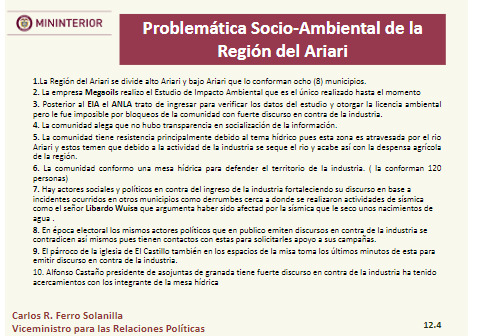 En este documento se nombran a varios líderes y organizaciones ambientales que participan en protestas y plantones, además, de cómo han sido sus reclamos. Patricia Pardo, lideresa de Cubarral, es descrita como “Comerciante del municipio, se encuentra presente en todos los bloqueos, es muy influyente en la zona y tiene discurso agresivo contra la industria”. También, señala al sacerdote de El Castillo de “emitir discursos en contra de la industria” al final de las misas. Los líderes consideran que estos documentos de instituciones estatales los ponen en riesgo, más aún, en medio de las amenazas que ya han recibido algunos de ellos.