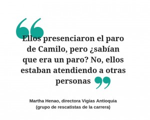 Martha Henao, la directora de Vigías Antioquia, responde que la congestión impedía a su equipo definir con certeza las necesidades de la atención. “Nos informaron que había gente gritando y pidiendo auxilio, pero hay que tener en cuenta los gritos de los demás competidores, la música de la tarima y además había un animador. Con todo ese bullicio no se escucha claramente un llamado”. El animador, sin embargo, es la persona que en el video de Edwin Henao se escucha pidiendo por los altavoces la atención de un paramédico para Juan Camilo, incluso antes de que cruzara la meta.
