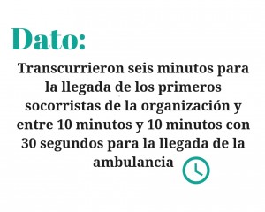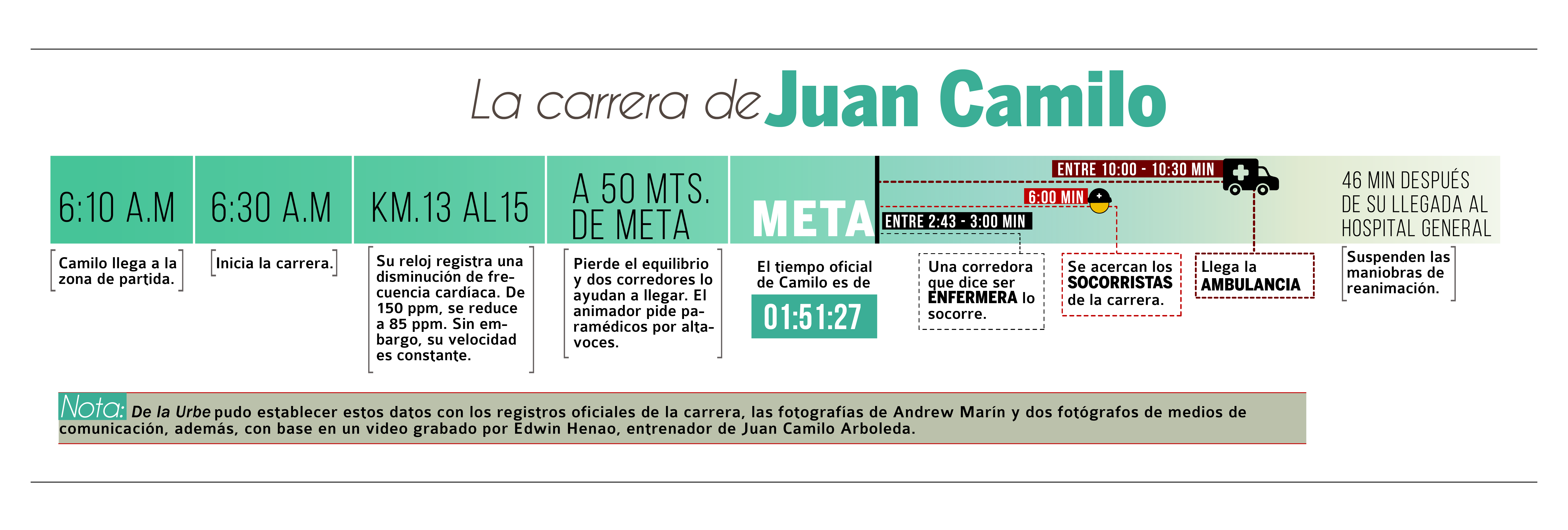 Con base en las horas registradas en las secuencias fotográficas y en el video, y al triangular esos datos con los registros de la competencia, es posible afirmar que luego del paso de Juan Camilo por la meta, transcurrieron seis minutos para la llegada de los primeros socorristas de la organización y entre 10 minutos y 10 minutos con 30 segundos para la llegada de la ambulancia.