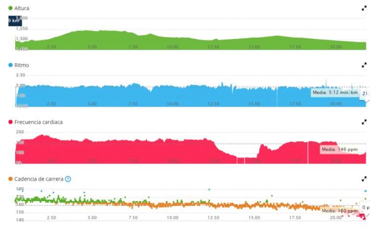 En los entrenamientos y las competencias, monitoreaba su actividad con un reloj Garmin Fenix 2. Los datos registrados por ese equipo en la carrera del 16 de septiembre muestran un comportamiento anormal en su frecuencia cardiaca. Mientras el promedio durante toda la carrera es de 150 pulsaciones por minuto (ppm), entre los kilómetros 12.5 y 15 se reduce a 85 ppm, pese a que su velocidad se mantiene constante.