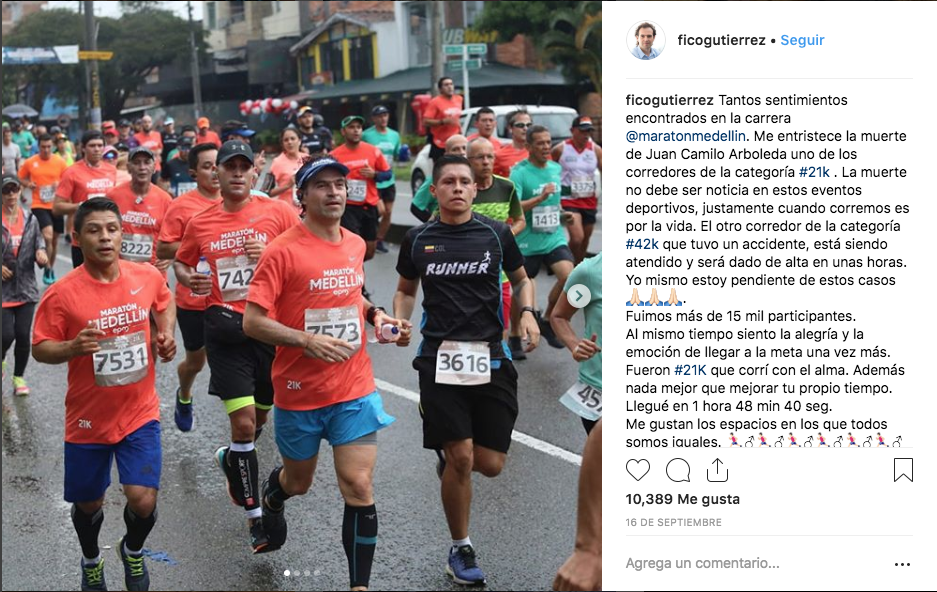 No obstante, al resultado “excelente” del que habló el director de la carrera se suma la publicación que hizo en sus redes sociales el alcalde de Medellín Federico Gutiérrez el mismo día de la competencia. El alcalde escribió que tenía “sentimientos encontrados”, que le entristecía la muerte de Juan Camilo, que estaba atento a su caso y al del atleta keniata, pero que al mismo tiempo sentía “la alegría y la emoción de llegar a la meta una vez más. Fueron 21K que corrí con el alma. Además nada mejor que mejorar tu propio tiempo. Llegué en 1 hora 48 min 40 seg”.