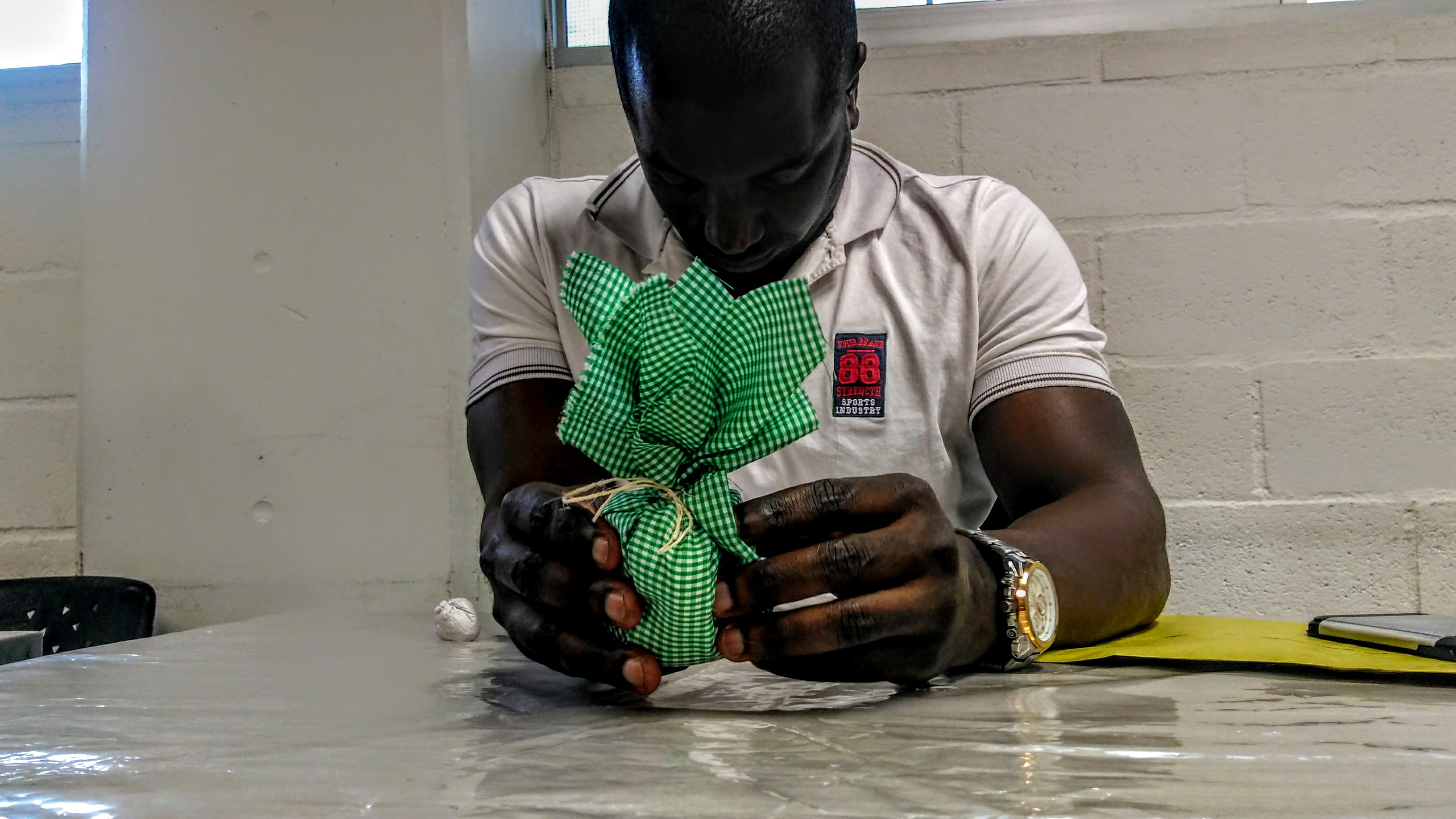 Me acerqué a Jair cuando vi que se encontraba solitario observando detenidamente un reloj plateado que sostenía entre sus manos, parecía que se encontraba desconectado de su entorno, como si un pensamiento lo invadiera en ese momento. Quise acercarme, María había mencionado que Jair debía irse rápido, así que me acerque a él, me senté a su lado y me dijo - me encanta estar aquí, pero debo irme porque trabajo como vigilante de seguridad en un edificio a las cinco y media- en ese momento eran las dos y media y el taller aún no había comenzado, de modo que comprendí cuál era su preocupación.