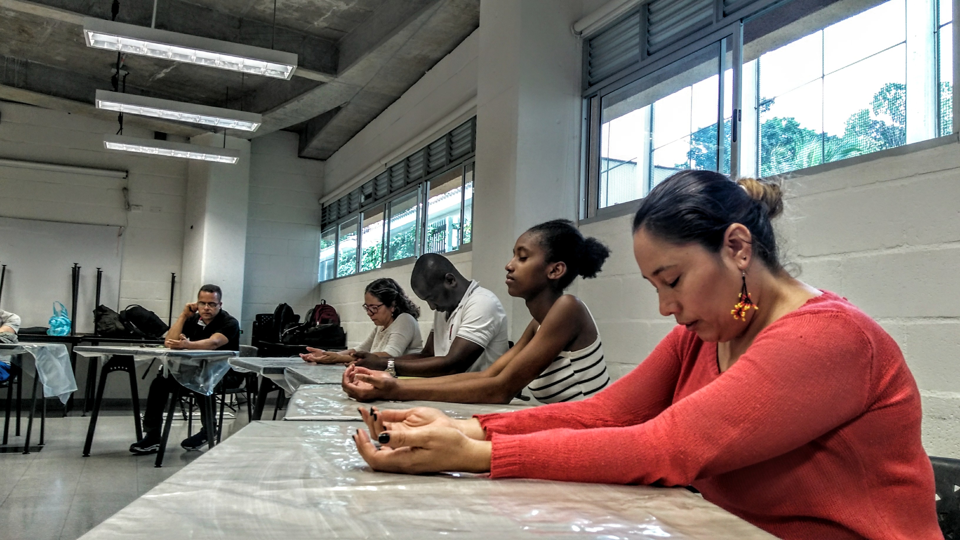Cuando llegamos, tuvimos que esperar un rato mientras nos dejaban ingresar a las instalaciones, y mientras tanto, me fijé detenidamente en las personas que iban llegando; algunos venían en sillas de ruedas, otros en muletas o portando gafas oscuras, pero todos mostrando una sonrisa calmada y ligera. Nos dirigimos a un salón iluminado por la claridad del Sol, rodeado de paredes blancas y un ambiente de serenidad y quietud donde tendría lugar el taller. Para mí ese lugar era como un templo, donde sentías mucha paz y tranquilidad, la sillas estaban distribuidas de tal forma que se pudiese establecer un diálogo y observar el rostro de las personas.