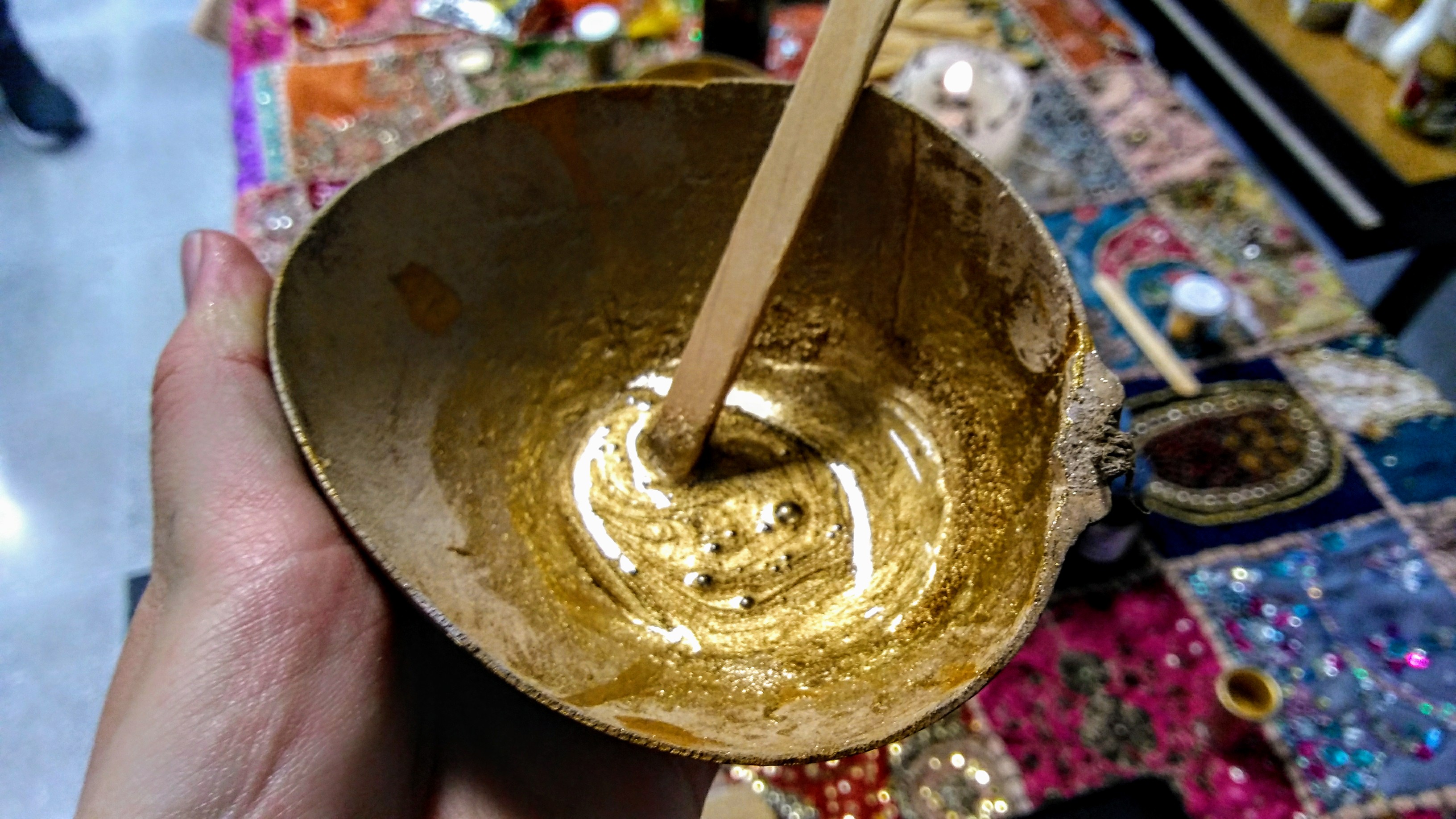 Resina dorada para pegar las piezas en el taller de Kintsugi.