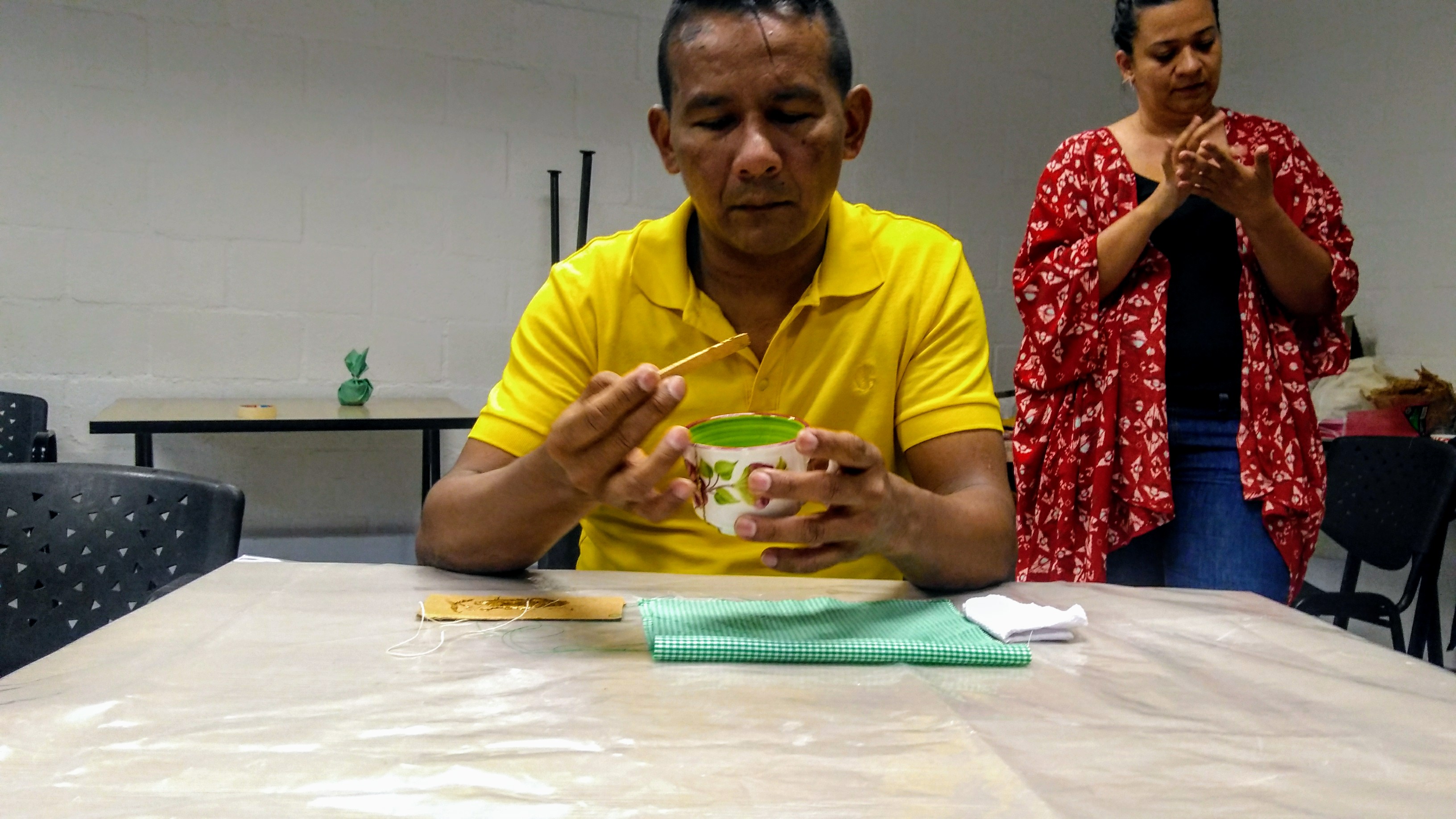 En medio del taller del kintsugi, hablé con ambos para mirar las piezas que habían reconstruido, Anita, por su parte, tenía un pocillo con flores verdes llamado “Dios me brinda varias oportunidades”, y se veía muy feliz mientras reparaba su pocillo. Don Luis Eduardo, reconstruyó un pocillo con flores azules que tituló “La fortaleza”, donde me explicó que esa era la fuerza que él sintió para volver a caminar, porque en el momento en que él pisó la mina, no quedó inconsciente, pero ya no podía sentir su pierna ni volver a moverla de nuevo, pero con ayuda de la prótesis y de todas las terapias que él recibió, pudo volver a moverse libremente por la tierra.