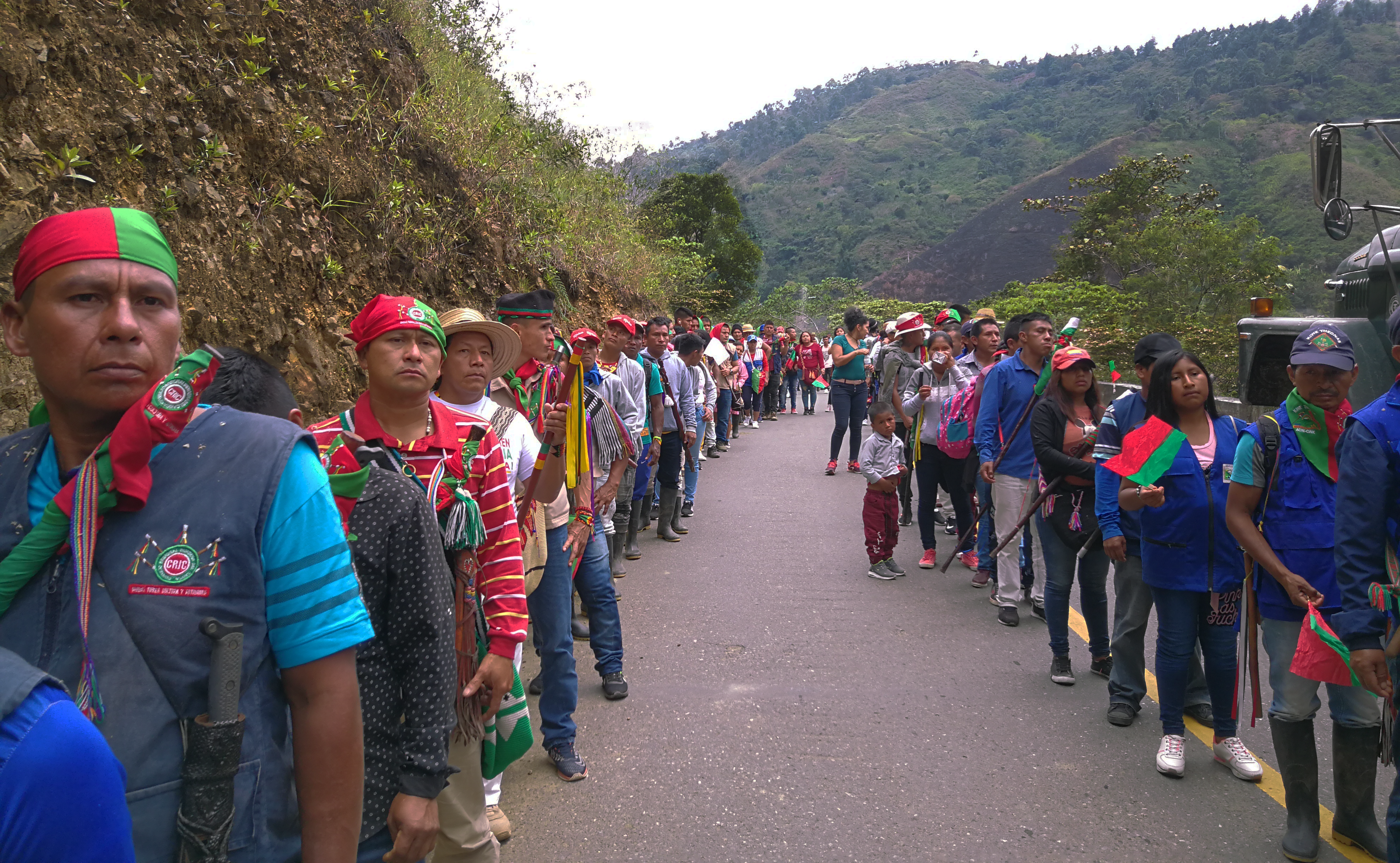 Avanzamos junto a Hermes Pete hacia el encuentro de la marcha de la Guardia Indígena en Toribío. “A pesar de los asesinatos y de las amenazas no vamos a retroceder, seguiremos al frente y seguramente nos costará la vida, pero no es nuevo, hace mucho que venimos sufriendo este flagelo”, dice Pete. Unos minutos antes de entrar en la marea verde, roja, blanca y azul que es esta marcha festiva y a la vez fúnebre, Pete, de 36 años, contó que es hijo de padres analfabetas, que un día descubrió que sus abuelos habían sido líderes y, desde entonces, siendo apenas un adolescente asumió como suya esta lucha que lo ha llevado a ser un vocero varias veces amenazado e incluso atacado. No tiene miedo, dice, o le queda poco. Lo que lamenta es la zozobra de su familia, la congoja, el temor ante esa llamada que tal vez les dé una mala noticia. También lamenta, pero lo asume, que su hijo de doce años hubiera sido designado gobernador (una especie de Consejero Mayor) en su escuela y que hubiera declinado el nombramiento. “Es que a todos los gobernadores los están matando”, le dijo el niño.