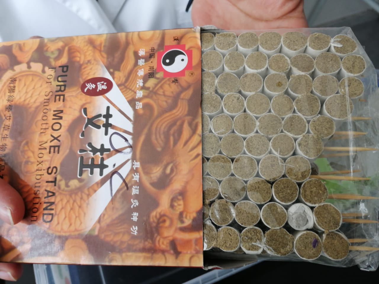 La moxibustión es un tratamiento que forma parte de la medicina tradicional china. Utiliza las hojas pulverizadas, secadas y trituradas de la planta Artemisia abrotanum a la que se le da forma de cigarro denominado moxa. El moxa se pone en la parte del cuerpo que se desee, con el objetivo de estimular el flujo de la sangre. También se usan en terapia de acupuntura. Foto: Carlos Mora.