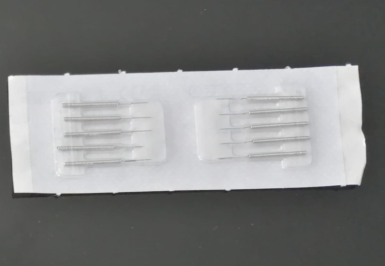 Estas son algunas de las agujas utilizadas en terapias de acupuntura. Debido a su tamaño, se usan para los oídos y el rostro. Foto: Carlos Mora.
