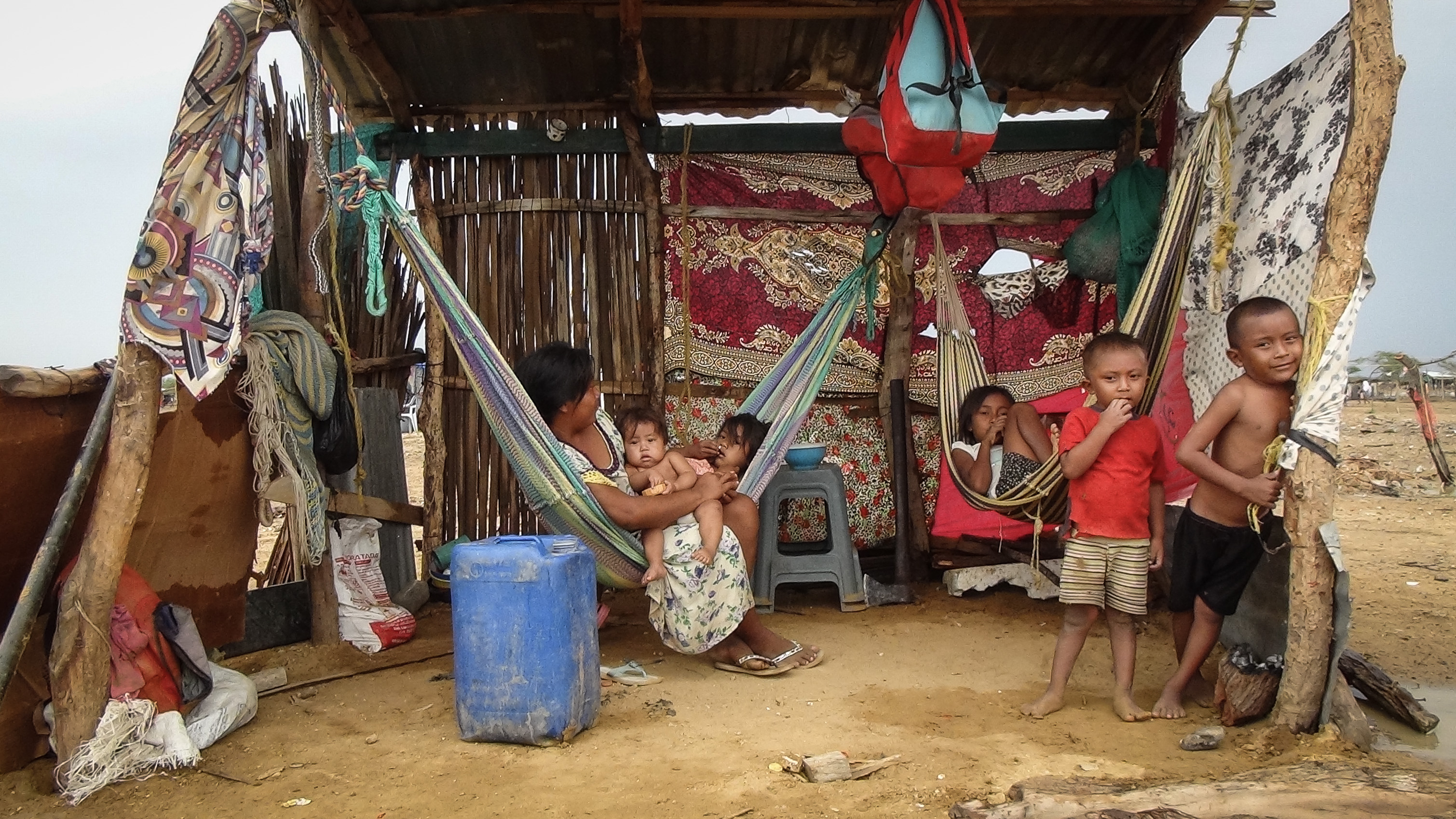 Las familias que llegaron de Venezuela tienen pocas cosas para subsistir. Dentro de los ranchos cuelgan chinchorros o kanas donde duermen; cuentan con poca ropa, ollas y vasijas. Pero escasean el agua y los alimentos. “Esos niños están desnutridos. Mírelos. Necesitamos ayuda, comida, agua”, dice con angustia María de los Ángeles Fernández, líder wayuu. Se refiere a tres niños, menores de cinco años de edad, que llegaron junto a su madre provenientes del municipio de Machiques de Perijá, distante tres horas de Maracaibo, en el Estado Zulia.
