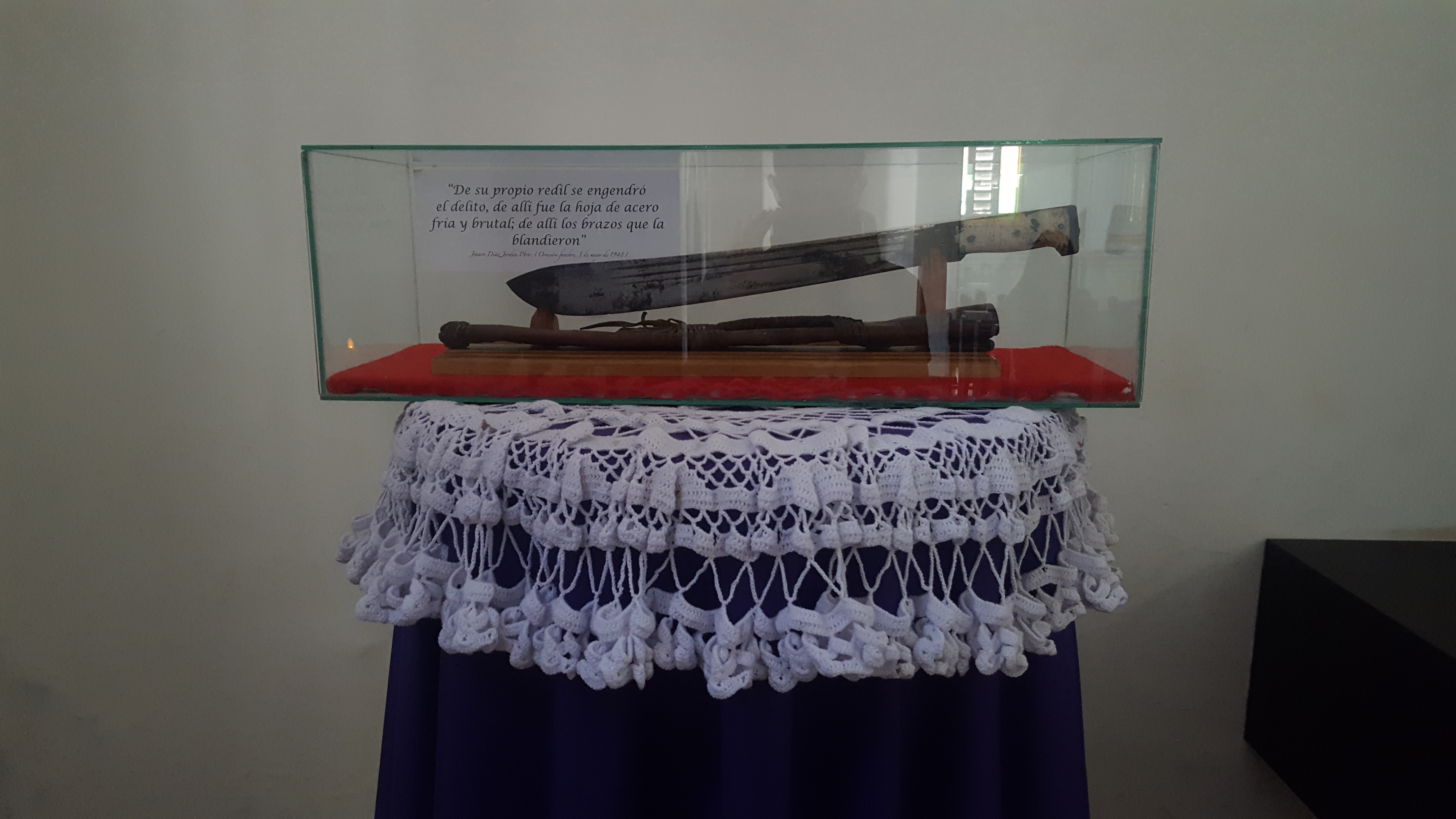 Después de pronunciar estas palabras, el sacerdote toma la última comunión y, a su vez, destruye lo que queda de los elementos sagrados, pues siente que la turba puede profanarlos, y en su encuentro con los asesinos, entre empellones y empujones, es golpeado y azotado con machetes. Es conducido hasta la plaza de Armero, allí es donde la voz de mando se impone: “No más planazos. Denle por el filo”, en cuestión de milésimas de segundos, el filo del machete arremete contra la carne del mártir, el machetazo es dirigido hacia su cabeza y el padre es bañado en sangre, cae de rodillas y expresa las mismas palabras de Cristo: “Padre, perdónales. ¡Todo por Cristo!”. El cuerpo inerte del mártir cae bocabajo, y después, para asegurarse de que definitivamente esté muerto, le dan patadas por arriba y por los costados. Al final, deciden darle un golpe contundente en la cabeza.