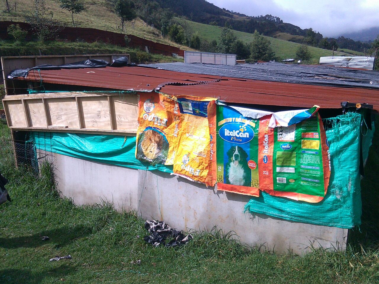 Doris debe arreglar el refugio prácticamente con las uñas. Entre plásticos, tablas, afiches y tapetes, cubre un poco los corrales de los perros para que no les entre tanto frío. Foto: Néstor Fernando Gálviz.