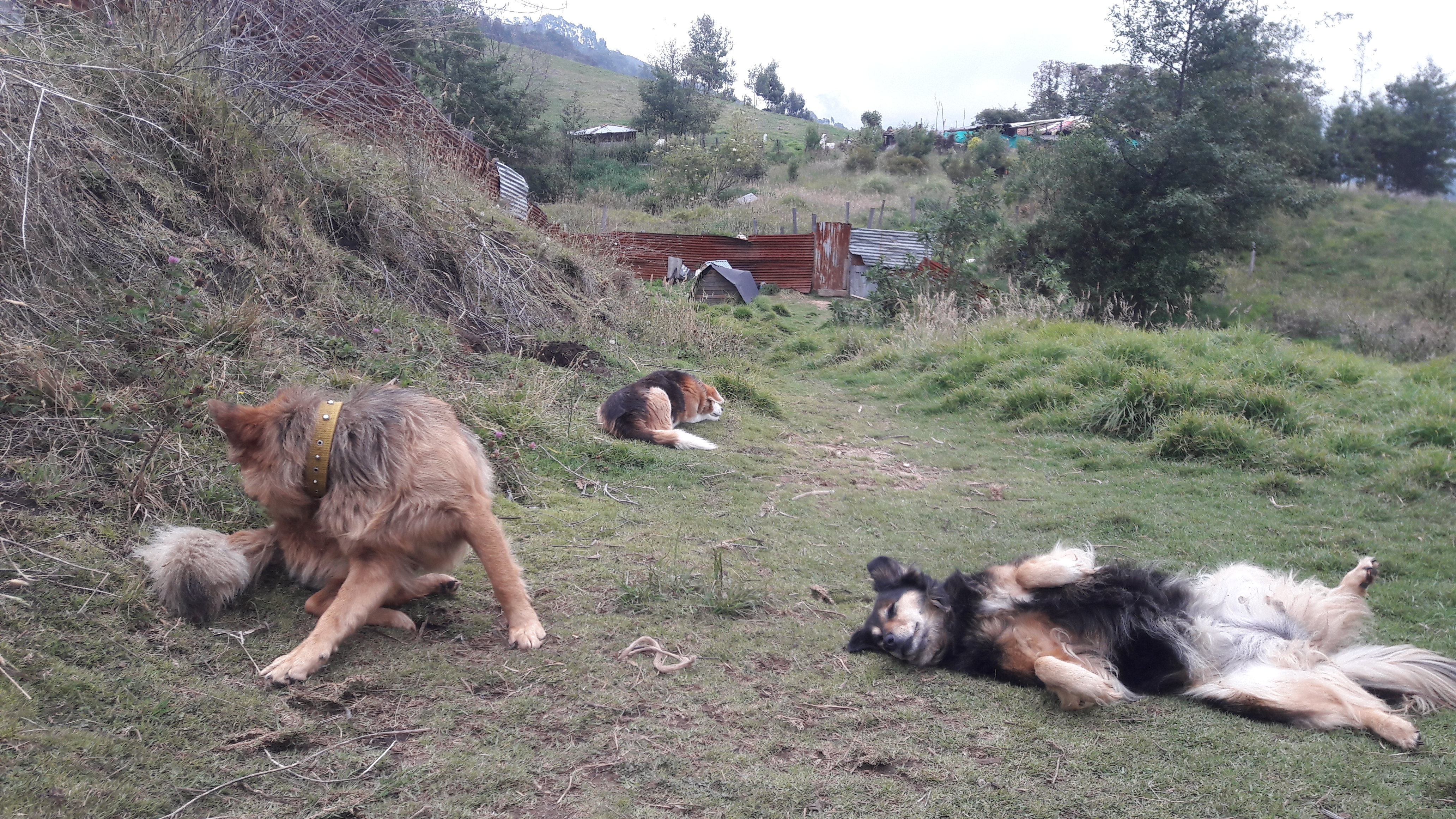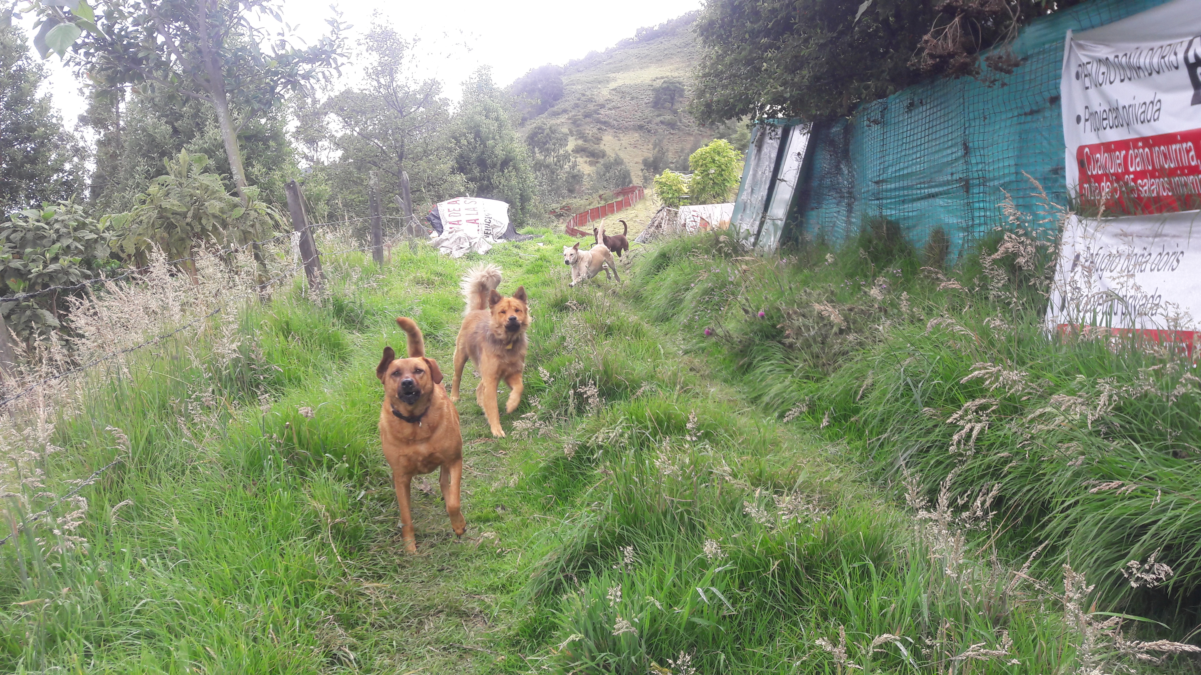 Pecas, Safira, Sasha y Toto corriendo a darle la bienvenida a la visita, como siempre, son los primeros en saludar. Foto: Maria Camila Botero Castro.