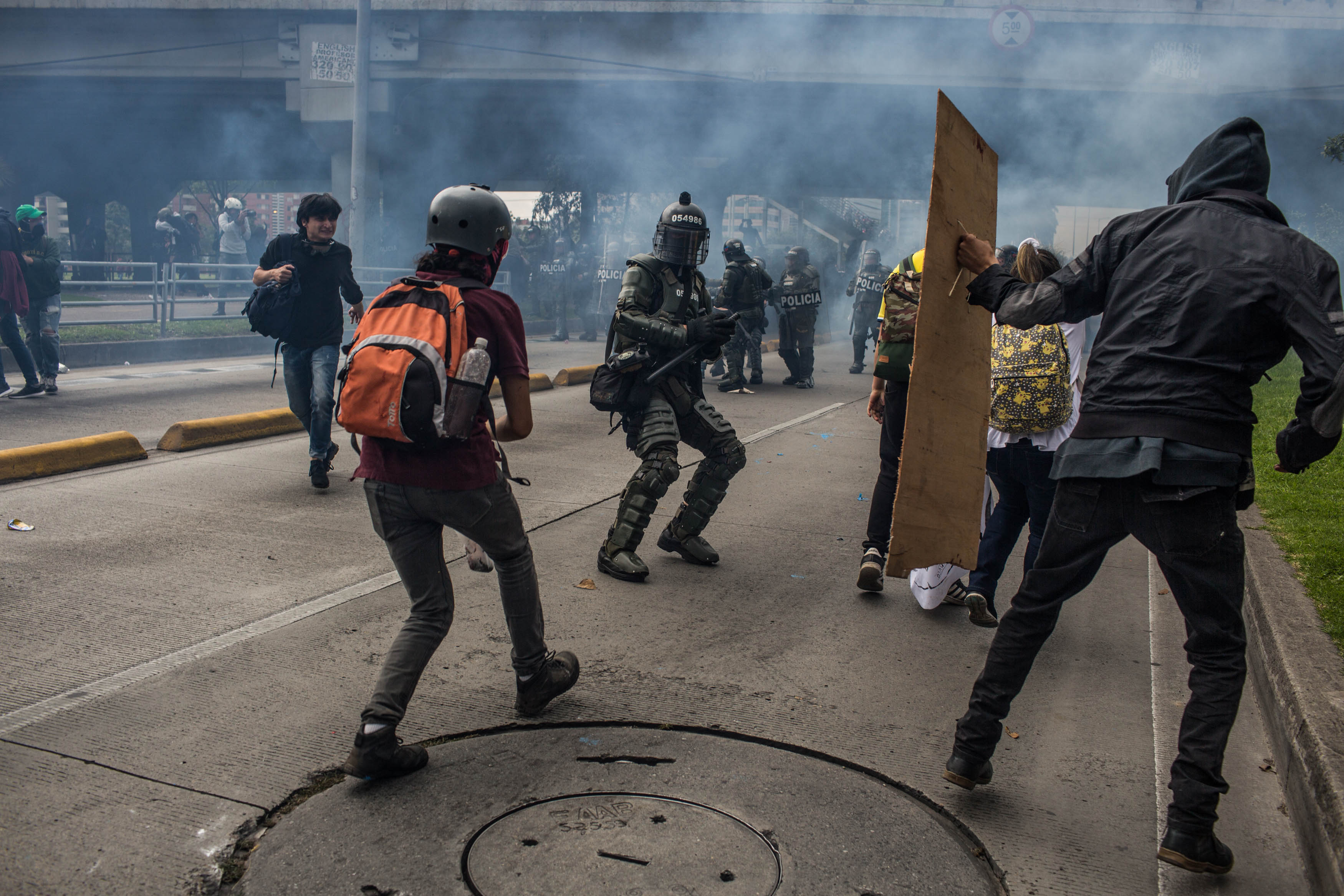 Con esa intención de causar daño coincide Juan David Peña, de 19 años, quien el 21 de noviembre cuando inició el paro, recibió un impacto de gas lacrimógeno que le causó una fractura de tibia. Tiene un mes de incapacidad aunque los médicos le dijeron que podrían ser tres. “Estábamos en son de hacer nuestra protesta pacífica cuando nos empezaron a corretear, quedábamos más cerquita del ESMAD. Estaban disparando los balines que disparan, estaban disparando aturdidoras (...) Antes de que me dispararan a mí, a otro muchacho que estaba tomando fotografías, el ESMAD le disparó también directo a la rodilla y empezó a sangrar muchísimo. Nos empezaron a disparar más seguido y más hacia las piernas de todos nosotros. Después me dispararon a mí”.
