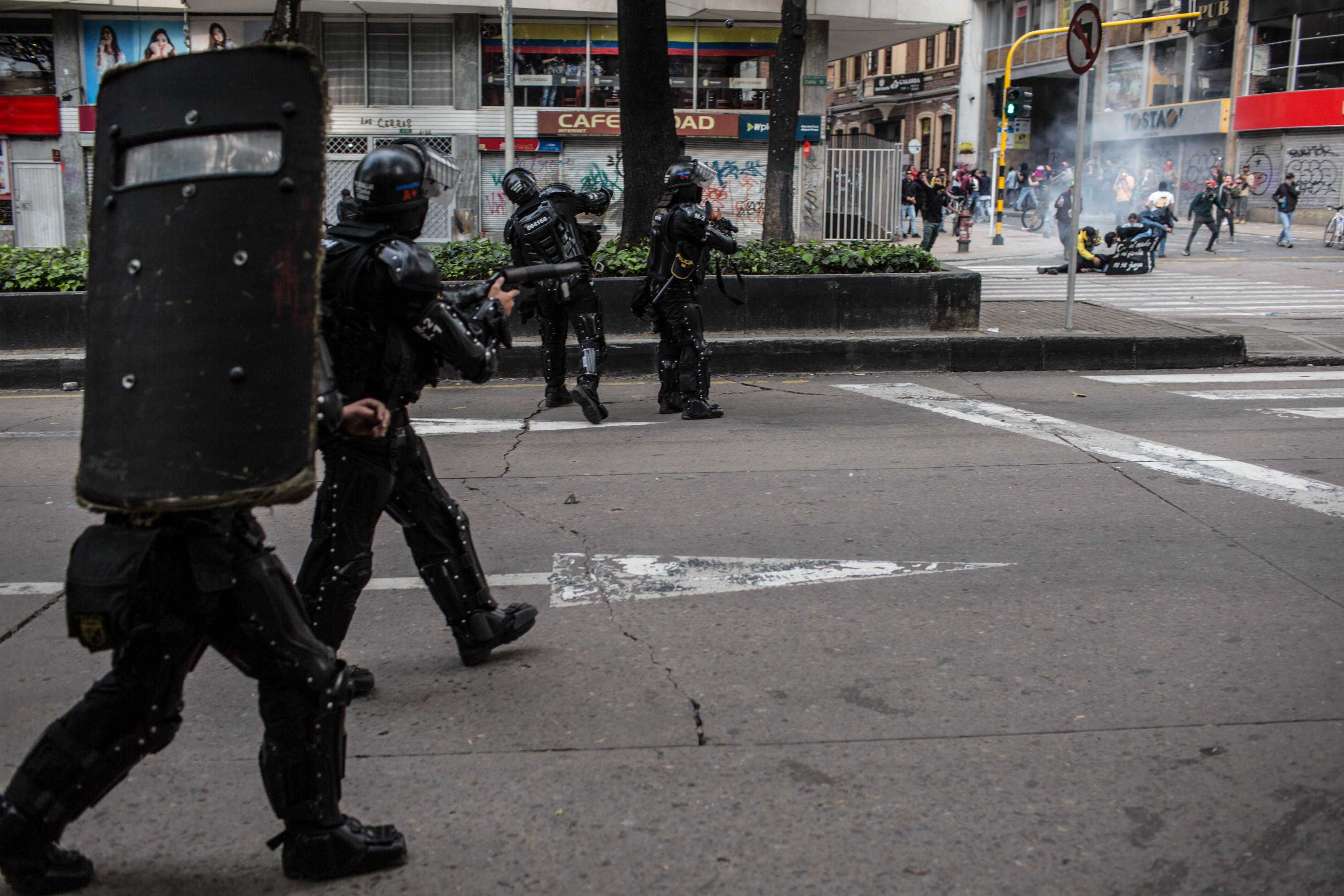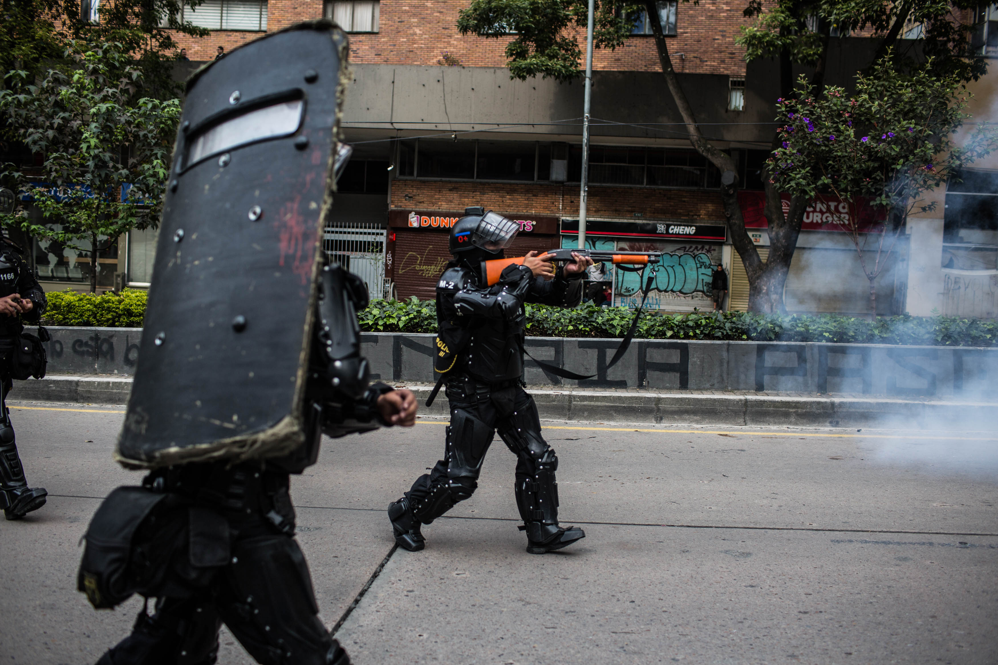 Un agente del ESMAD actúa durante las protestas del 23 de noviembre en Bogotá. | Crédito: Mauricio Morales – Instagram: @ mauriciomorales0