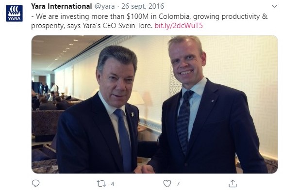 Yara es la empresa de fertilizantes más importante a nivel mundial. Con más de un siglo de historia, fue fundada en Noruega y tiene presencia en más de 50 países. En Colombia creció aún más con la compra de Abonos Colombianos S.A. (Abocol) en 2014 y desde entonces opera en Cartagena. En ese momento algunos analistas alertaron sobre la concentración del mercado de fertilizantes. Para 2016 la firma anunció una millonaria inversión en Colombia con un apretón de manos con el entonces presidente Juan Manuel Santos.