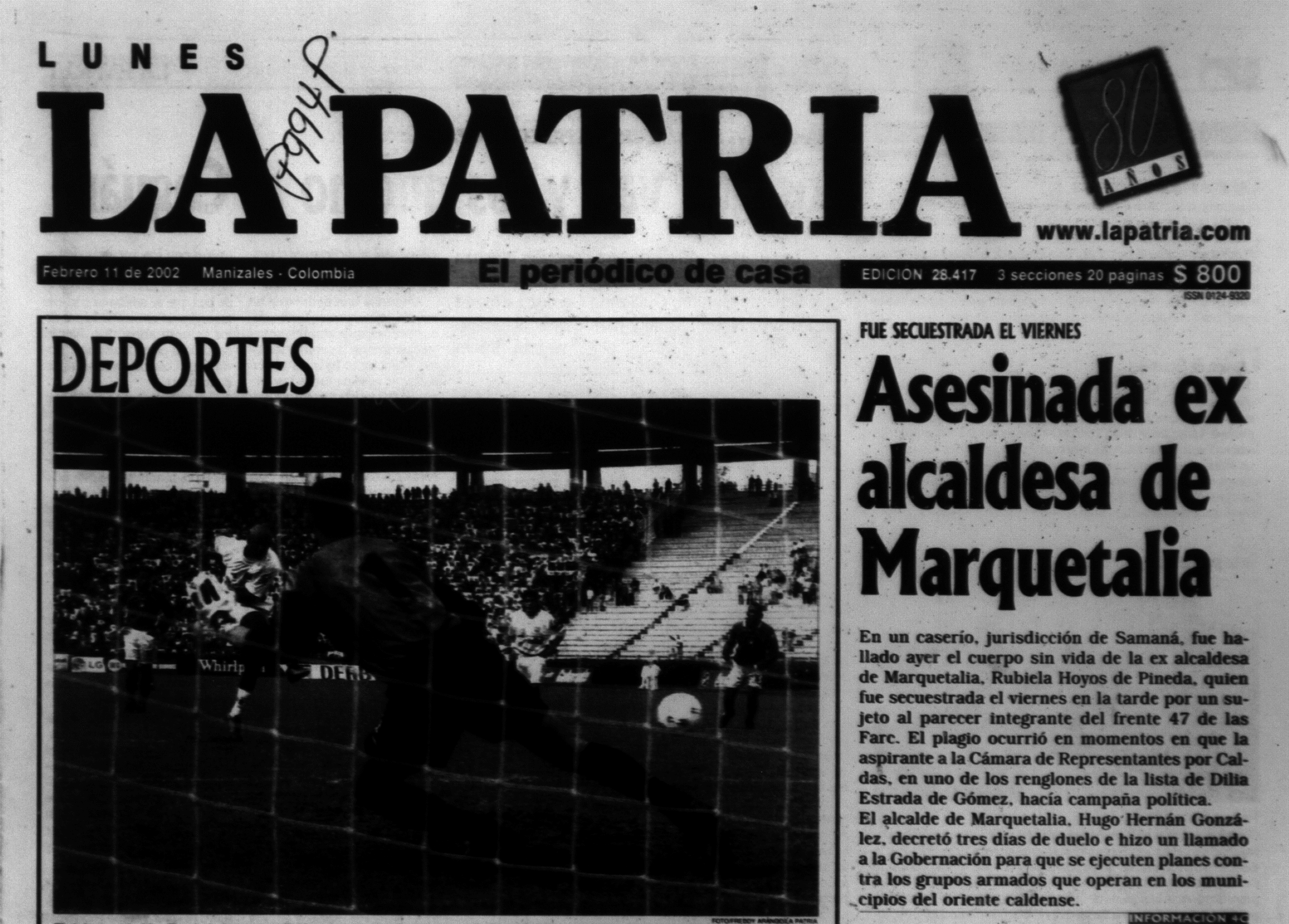Portada del periódico La Patria con la noticia del asesinato de Rubiela Hoyos de Pineda. (Hemeroteca biblioteca Luis Ángel Arango)