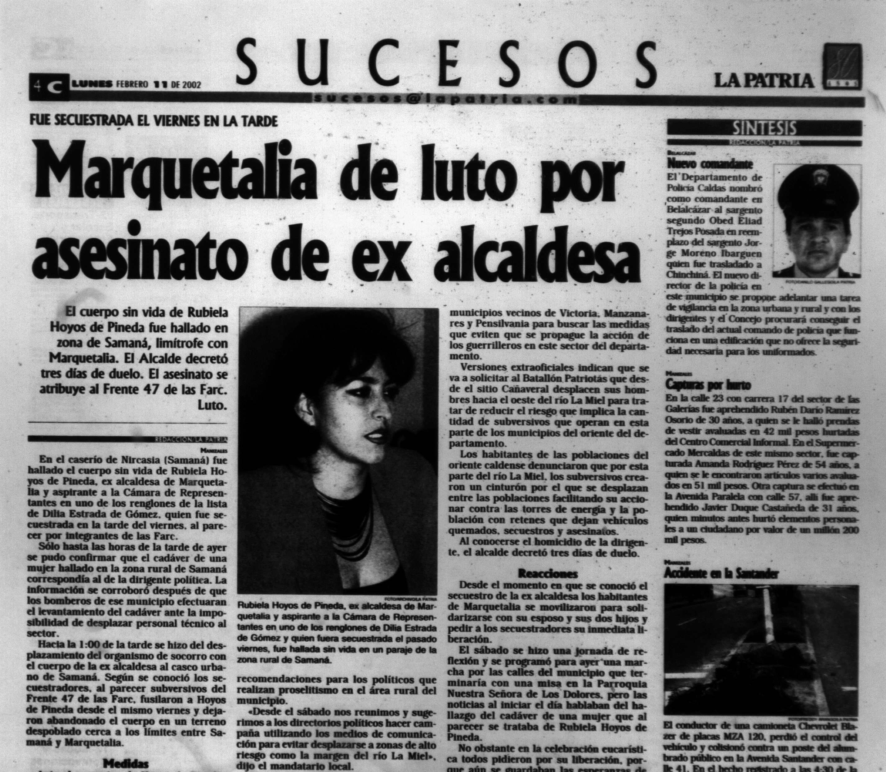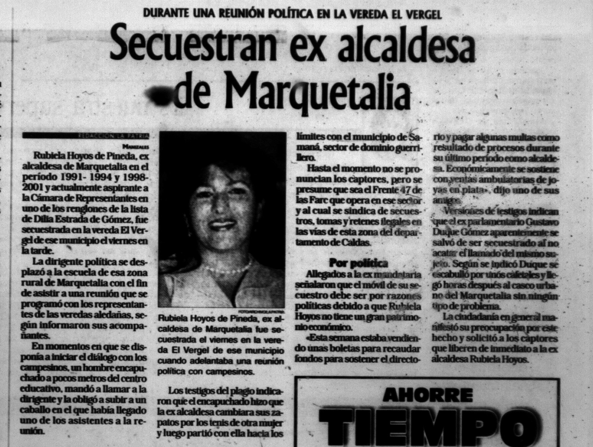 “Nosotros, prácticamente, fuerza pública no teníamos, teníamos solo unos policías en el área urbana y llevábamos un año y medio de una avanzada paramilitar de la zona del Magdalena Centro hacia arriba, para esa época ya habían pasado Marquetalia, ya había presencia en Manzanares, en Bolivia, San Daniel, en zonas de Pensilvania. Creo que para ese momento ya se había montado una base militar en Pensilvania, no sé si la de Cañaveral estaba funcionando todavía, puede que hubiera soldados campesinos cerquita, pero nada de eso era óbice para que los paramilitares no pasaran. Se fue dando que de la Miel para acá era paramilitar, y de la Miel para allá era guerrilla, a eso se vio expuesta nuestra gente”, cuenta Hugo Hernán González, alcalde Marquetalia en el momento del secuestro de Rubiela Hoyos y posteriormente Representante a la Cámara por Caldas.