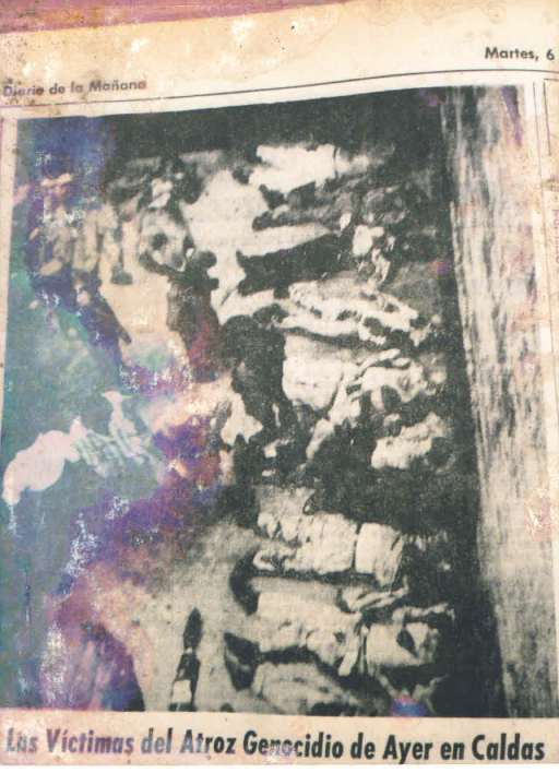 “De ahí levantaron los muertos y se los llevaron para Victoria en una volqueta. Ya estaba el ejército cuando yo llegué. Nadie decía nada, lo que se hablaba lo hablaba el ejército y la policía, decían que era una guerrilla, pero no especificaran nada. Eso lo habían planeado, según un libro que hay por ahí. Subieron por el lado del cañón del río Guarinó y se ubicaron desde las 4:30 de la mañana. En la casita había dos viejitos nada más y no les hicieron nada, ellos le cuidaban la casa a ese señor. Luego de eso recogían a los más pendejos, a los que decían, puede ser un guerrillero y el ejército lo llevaba para la hacienda Hamburgo que hacía las veces de base militar”, relata José Quiceno.