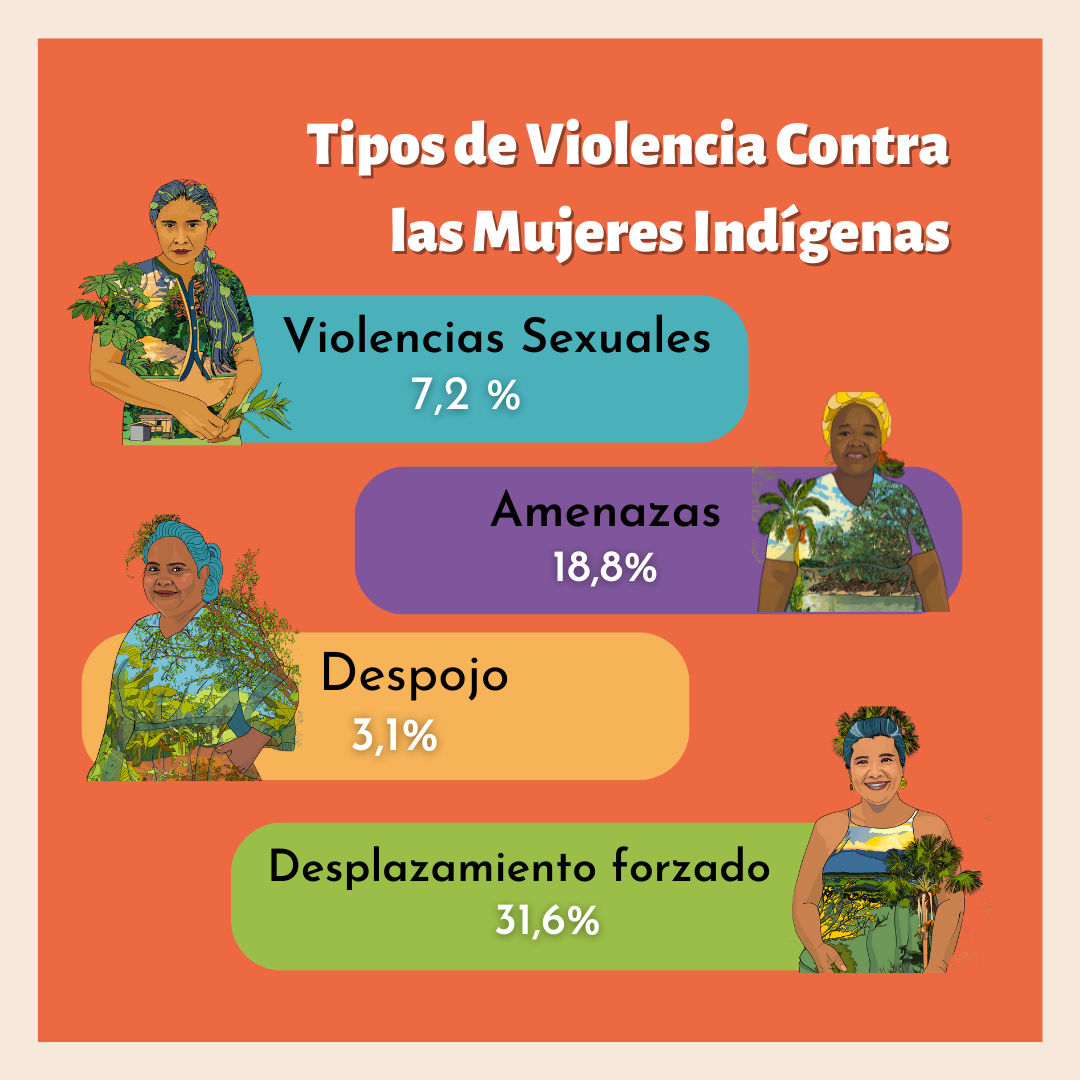 Las mujeres indígenas fueron afectadas de gran manera por este tipo de violencia, según el Informe Final de la Comisión de la Verdad, 31,6 % de las entrevistadas reportaron desplazamiento forzado y otro 3,21 % despojo de sus pertenencias. Sin embargo, estas mujeres han sido enfrentadas a mucho más que tener que dejar sus hogares, la Comisión encontró tres aspectos de violencia; primero el contínuum de violencias o violencias de larga relación que vienen desde los años de colonización española y ha dejado marcas o huellas hasta en el conflicto actual y el racismo en Colombia; la segunda siendo el ya mencionado desplazamiento forzado, que además lleva a la perdida de cultura e identidad de estas poblaciones; y la tercera la violencia por actores armados, tal como la violencia sexual como acto de desarmonía y castigo.