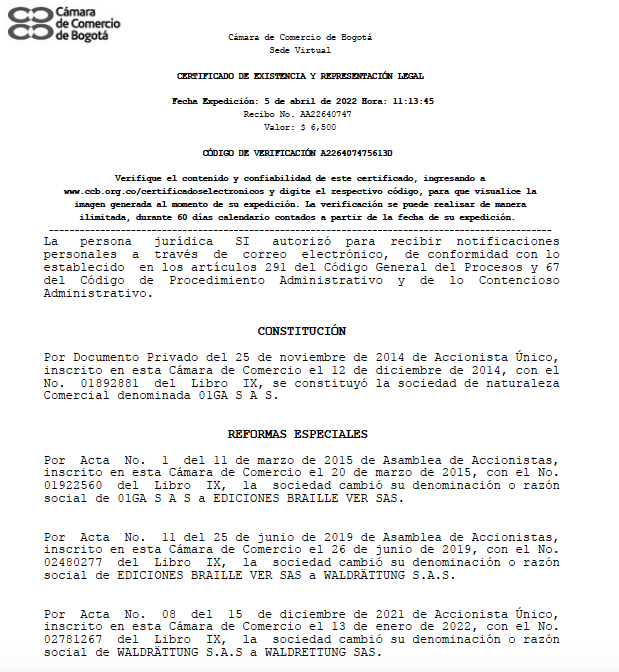 En Colombia, la historia de la empresa Waldrettung S.A.S. se remonta a noviembre de 2015, cuando fue inscrita en la Cámara de Comercio de Bogotá como O1GA S.A.S. Cuatro meses después su nombre fue cambiado a Ediciones Braille Ver S.A.S. El 26 de junio de 2019, esa empresa -de la cual Helmuth Gallego era único accionista- se convirtió en Waldrettung S.A.S. El objeto social cambió a “la estructuración, el desarrollo, la implementación, la puesta en marcha y ejecución de toda clase de proyectos ambientales en América Latina, particularmente aquellos que se puedan enmarcar en los estándares de mercados voluntarios como el VCS o el REDD o del mecanismo de desarrollo limpio del protocolo de Kyoto”, según consta en el expediente en la Cámara de Comercio de Bogotá. Es decir, el cambio en la naturaleza de la empresa se hizo cinco meses después de que se firmara el contrato con el representante legal del Gran Resguardo del Vaupés y cuatro meses antes de que la asamblea de éste lo aprobara. Un año después, en octubre de 2020, la empresa pasó de tener un capital autorizado de 500,000 pesos (unos 130 dólares de la época) a uno de 120,500,000 pesos (unos 31,300 dólares). Luego, en diciembre de 2021, finalmente cambió su nombre de Waldrättung S.A.S. por el actual de Waldrettung S.A.S.