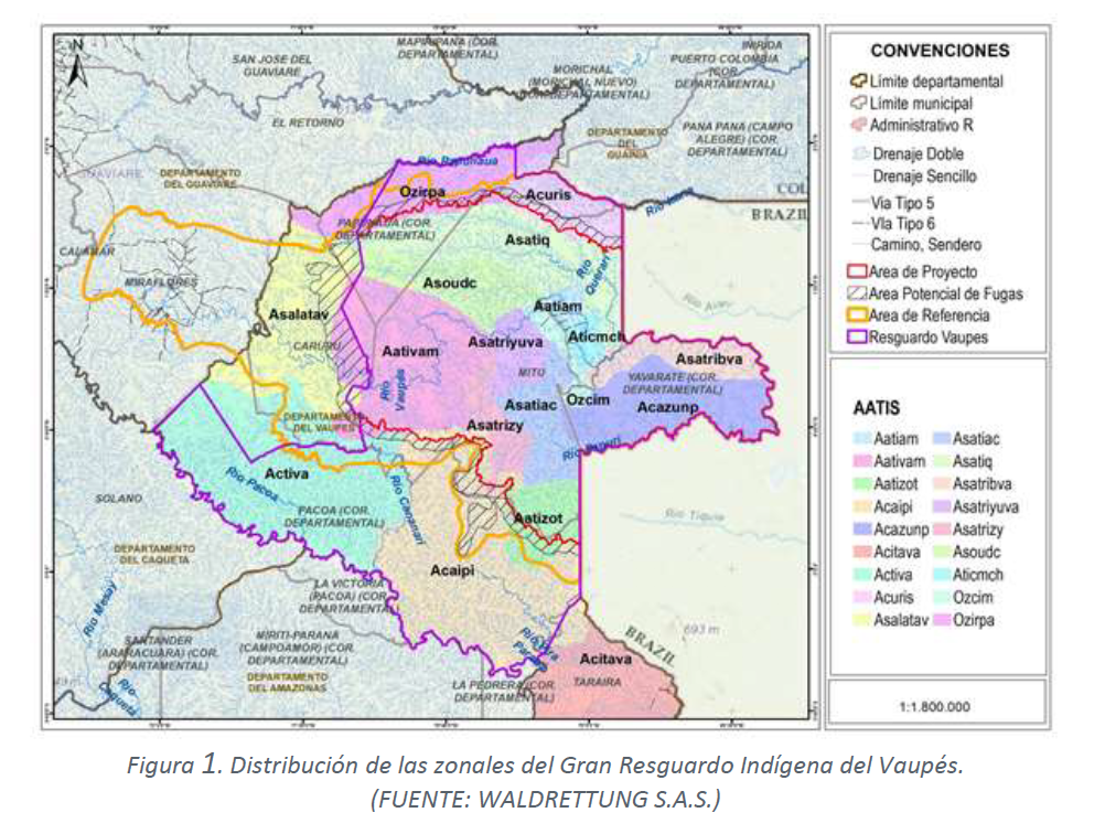 En total, se trata de un área con ecosistemas de bosque tropical (que los expertos detallan como bosque denso alto de tierra firme) y algunos bosques inundables cercanos a ríos, según consta en el ‘documento de diseño de proyecto’ (o PDD) de Waldrettung, que aparece desde inicios de 2021 en el Renare, el portal del Ministerio de Ambiente que registra las iniciativas de mitigación al cambio climático. Aunque desde la empresa insisten en que el proyecto ocupa todo el resguardo, el área registrada en el Renare como “en formulación” es menor, de aproximadamente unas 2,2 millones de hectáreas. Allí viven unas 19,900 personas repartidas en 155 comunidades que corresponden a 11 de las 17 asociaciones de autoridades tradicionales indígenas (AATIs) del resguardo.