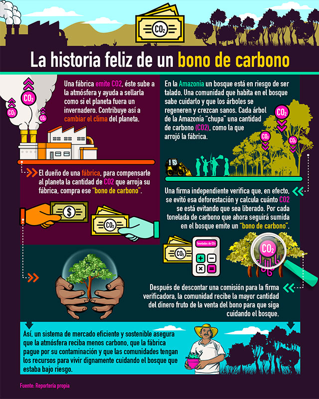Estos proyectos buscan preservar bosques fundamentales para mitigar la crisis climática global, invirtiendo el dinero recaudado por la venta de bonos de carbono en las comunidades que los habitan. Los bonos son comprados por empresas que buscan neutralizar el impacto ambiental causado por su actividad productiva. Cada bono suele compensar la emisión de una tonelada de dióxido de carbono, uno de los gases de efecto invernadero que propicia el cambio climático. En Colombia existen proyectos con comunidades afrodescendientes y campesinas, y con resguardos indígenas. Estos últimos son los más buscados para estas iniciativas porque cuidan las zonas más extensas de selva del país.