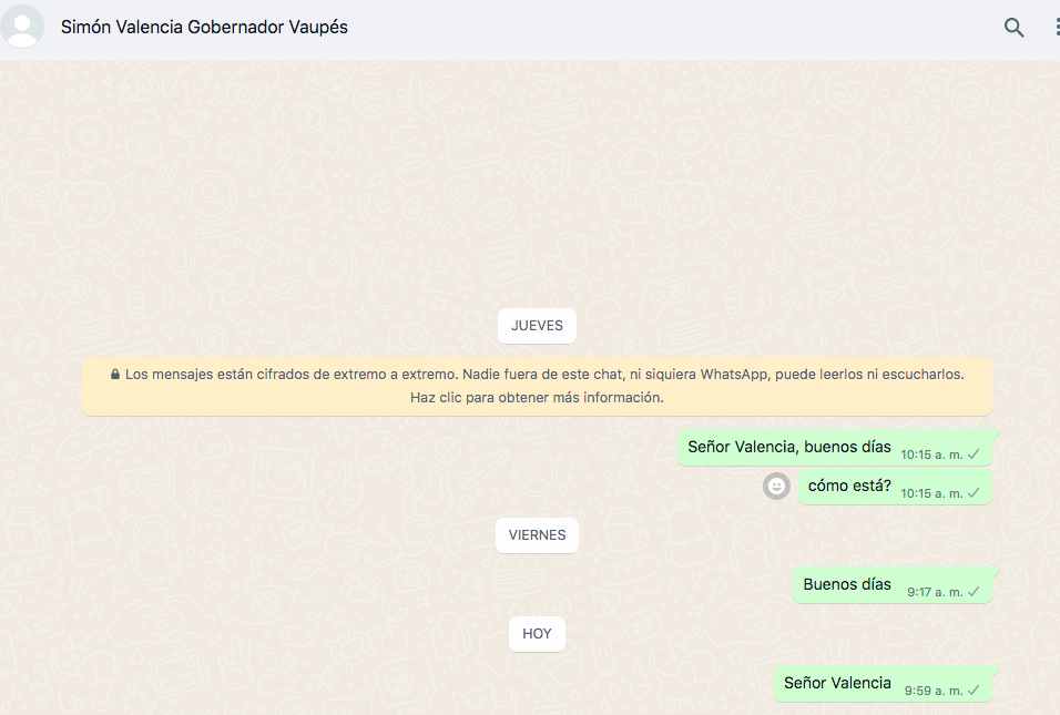 Imagen del chat con el chat del líder indígena Simón Valencia y del correo electrónico en el que se le solicitó una entrevista.