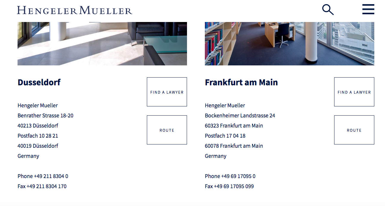 Imagen tomada de la página web de la empresa Hengeler Mueller en la que se ve la dirección de su sede en Frankfurt