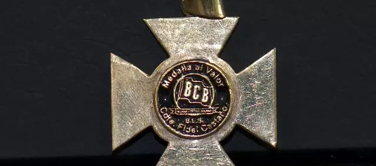 La medalla es un objeto con el que se premió la actividad delictiva. Tiene un grabado que dice "Medalla al valor" y las letras B.L.S., que corresponden al Bloque Libertadores del Sur del Comandante Fidel Castaño. Crédito: Unidad de Víctimas.
