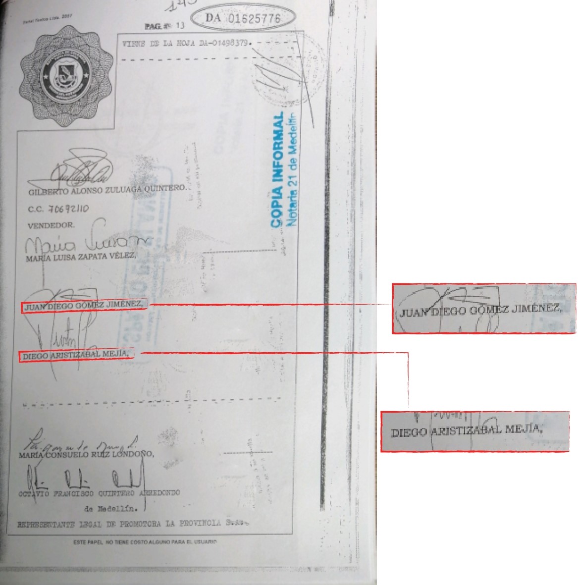 Diego Aristizábal Mejía, de 62 años en ese momento, compró el 4,6 % de la finca. Aristizábal fue incluido por el Departamento del Tesoro de Estados Unidos en la lista de negocios y personas asociados al narcotráfico, la Lista Clinton, entre 2010 y 2018, por pertenecer a la estructura criminal del narcotraficante Pedro Antonio Bermúdez Suaza, alias El Arquitecto, piloto de Pablo Escobar y socio de Joaquín ‘El Chapo’ Guzmán. En 1981 Aristizábal también fue miembro de la junta directiva de Confirmesa, empresa involucrada en el asesinato de Guillermo Cano, director de El Espectador.